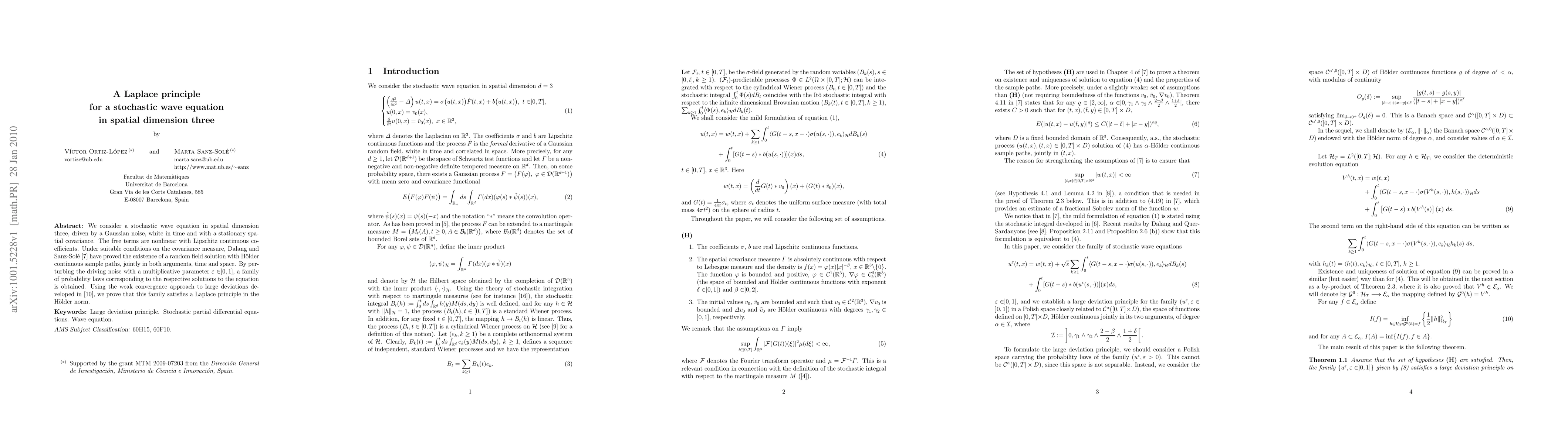 This paper investigates a stochastic wave equation in three dimensions driven by Gaussian noise, proving the existence of a random field solution. It demonstrates that the family of probability laws corresponding to solutions exhibits a Laplace principle under weak convergence, indicating large deviation behavior.