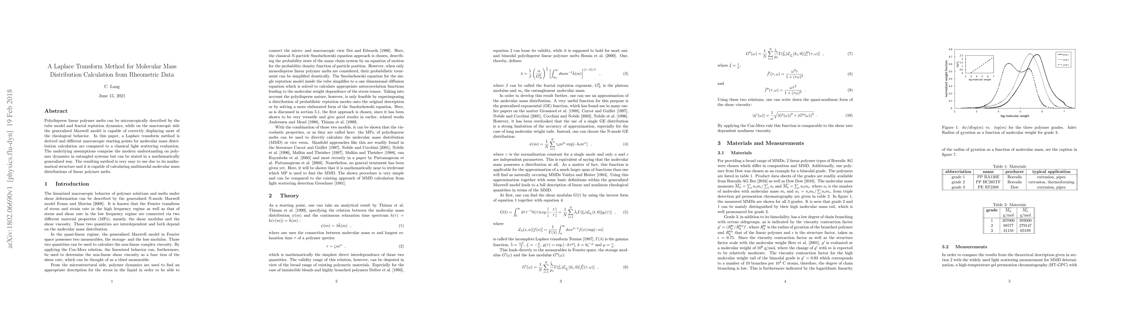 Polydisperse linear polymer melts can be microscopically described by the tube model and fractal reptation dynamics, while on the macroscopic side the generalized Maxwell model is capable of correctly displaying most of the rheological behavior. In this paper, a Laplace transform method is derived and different macroscopic starting points for molecular mass distribution calculation are compared to a classical light scattering evaluation. The underlying assumptions comprise the modern understanding on polymer dynamics in entangled systems but can be stated in a mathematically generalized way. The resulting method is very easy to use due to its mathematical structure and it is capable of calculating multimodal molecular mass distributions of linear polymer melts.