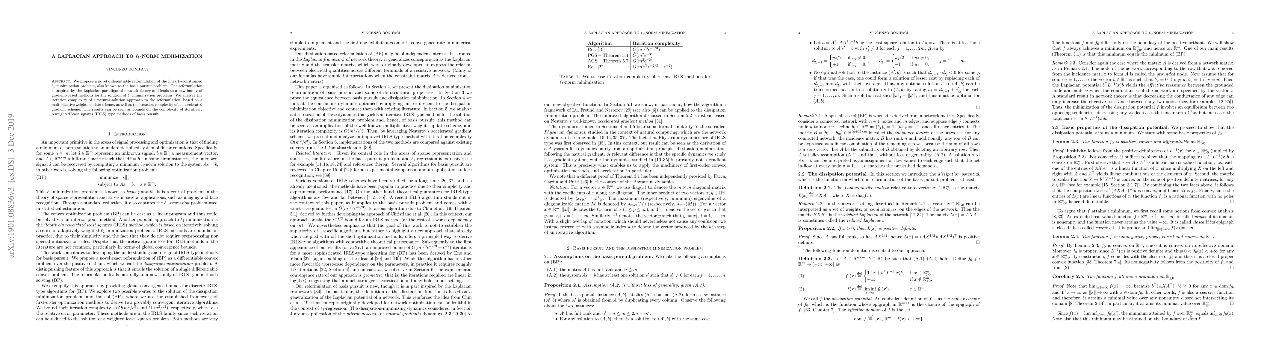This paper introduces a differentiable reformulation of the $\ell_1$-norm minimization problem using the Laplacian paradigm, leading to new gradient-based methods. It analyzes the iteration complexity of both a multiplicative weights update scheme and an accelerated gradient scheme, providing bounds on the complexity of iterative reweighted least squares methods for basis pursuit.