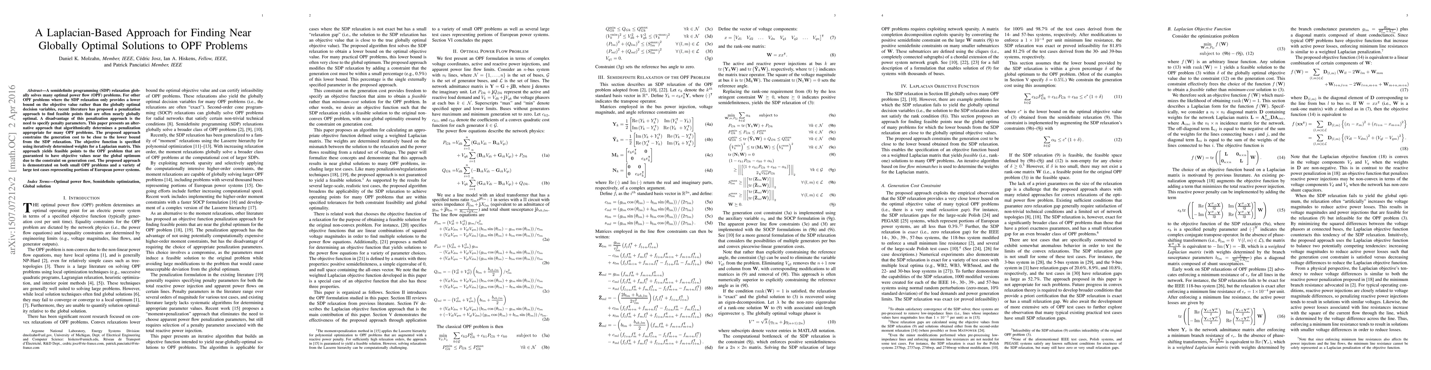 A semidefinite programming (SDP) relaxation globally solves many optimal power flow (OPF) problems. For other OPF problems where the SDP relaxation only provides a lower bound on the objective value rather than the globally optimal decision variables, recent literature has proposed a penalization approach to find feasible points that are often nearly globally optimal. A disadvantage of this penalization approach is the need to specify penalty parameters. This paper presents an alternative approach that algorithmically determines a penalization appropriate for many OPF problems. The proposed approach constrains the generation cost to be close to the lower bound from the SDP relaxation. The objective function is specified using iteratively determined weights for a Laplacian matrix. This approach yields feasible points to the OPF problem that are guaranteed to have objective values near the global optimum due to the constraint on generation cost. The proposed approach is demonstrated on both small OPF problems and a variety of large test cases representing portions of European power systems.