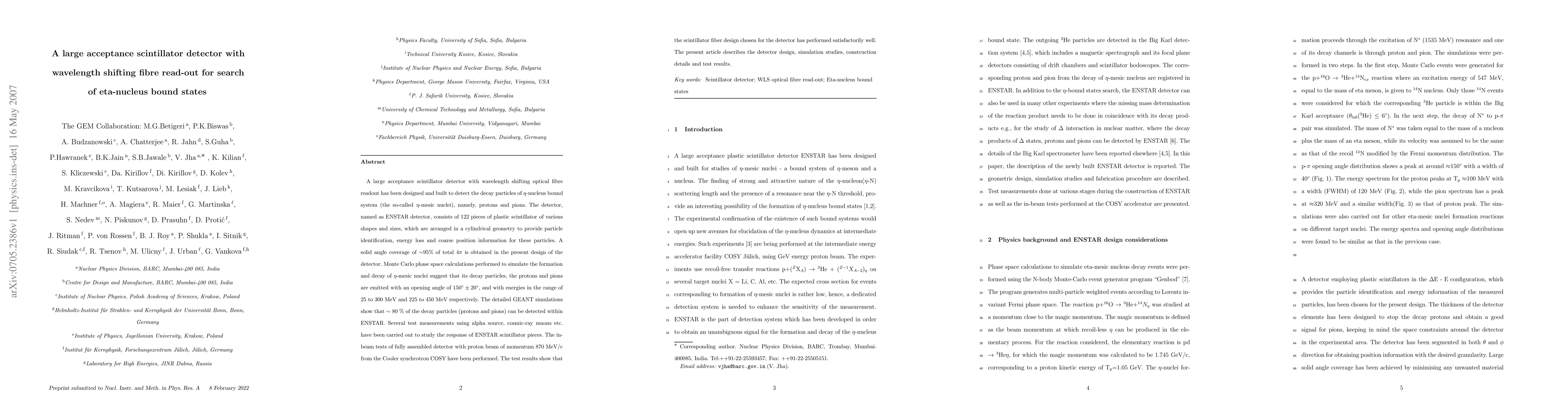 A large acceptance scintillator detector with wavelength shifting optical fibre readout has been designed and built to detect the decay particles of $\eta$-nucleus bound system (the so-called $\eta$-mesic nuclei), namely, protons and pions. The detector, named as ENSTAR detector, consists of 122 pieces of plastic scintillator of various shapes and sizes, which are arranged in a cylindrical geometry to provide particle identification, energy loss and coarse position information for these particles. A solid angle coverage of $\sim$95% of total 4$\pi$ is obtained in the present design of the detector. Monte Carlo phase space calculations performed to simulate the formation and decay of $\eta$-mesic nuclei suggest that its decay particles, the protons and pions are emitted with an opening angle of 150$^\circ \pm 20^\circ$, and with energies in the range of 25 to 300 MeV and 225 to 450 MeV respectively. The detailed GEANT simulations show that $\sim$ 80 % of the decay particles (protons and pions) can be detected within ENSTAR. Several test measurements using alpha source, cosmic-ray muons etc. have been carried out to study the response of ENSTAR scintillator pieces. The in-beam tests of fully assembled detector with proton beam of momentum 870 MeV/c from the Cooler synchrotron COSY have been performed. The test results show that the scintillator fiber design chosen for the detector has performed satisfactorily well. The present article describes the detector design, simulation studies, construction details and test results.