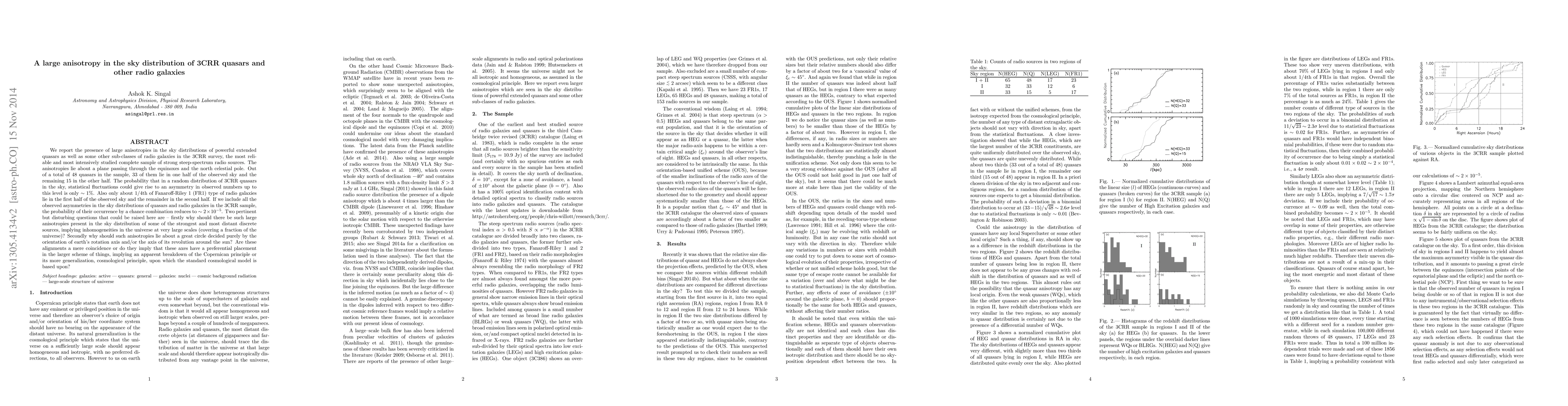 This paper reports significant anisotropies in the sky distribution of 3CRR quasars and other radio galaxies, with most sources clustering in one half of the sky. The probability of this alignment occurring by chance is extremely low, raising questions about large-scale inhomogeneities in the universe and potential breakdowns of the cosmological principle.
