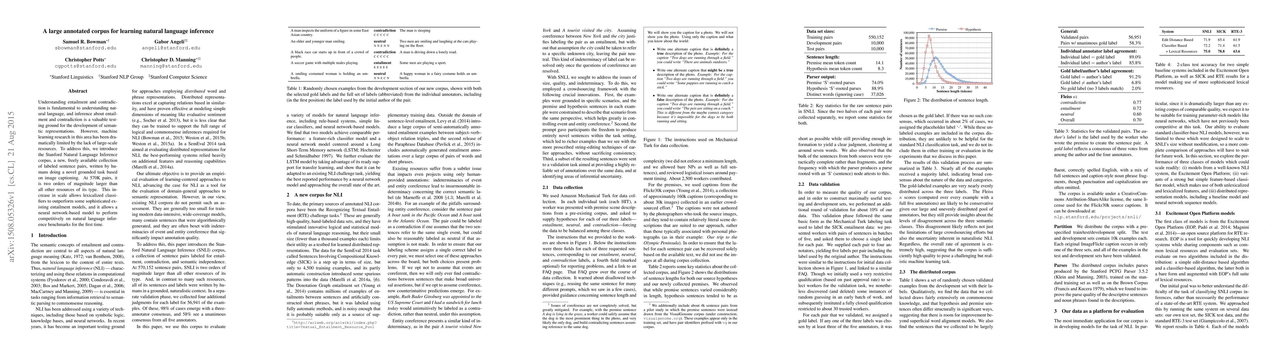 Understanding entailment and contradiction is fundamental to understanding natural language, and inference about entailment and contradiction is a valuable testing ground for the development of semantic representations. However, machine learning research in this area has been dramatically limited by the lack of large-scale resources. To address this, we introduce the Stanford Natural Language Inference corpus, a new, freely available collection of labeled sentence pairs, written by humans doing a novel grounded task based on image captioning. At 570K pairs, it is two orders of magnitude larger than all other resources of its type. This increase in scale allows lexicalized classifiers to outperform some sophisticated existing entailment models, and it allows a neural network-based model to perform competitively on natural language inference benchmarks for the first time.