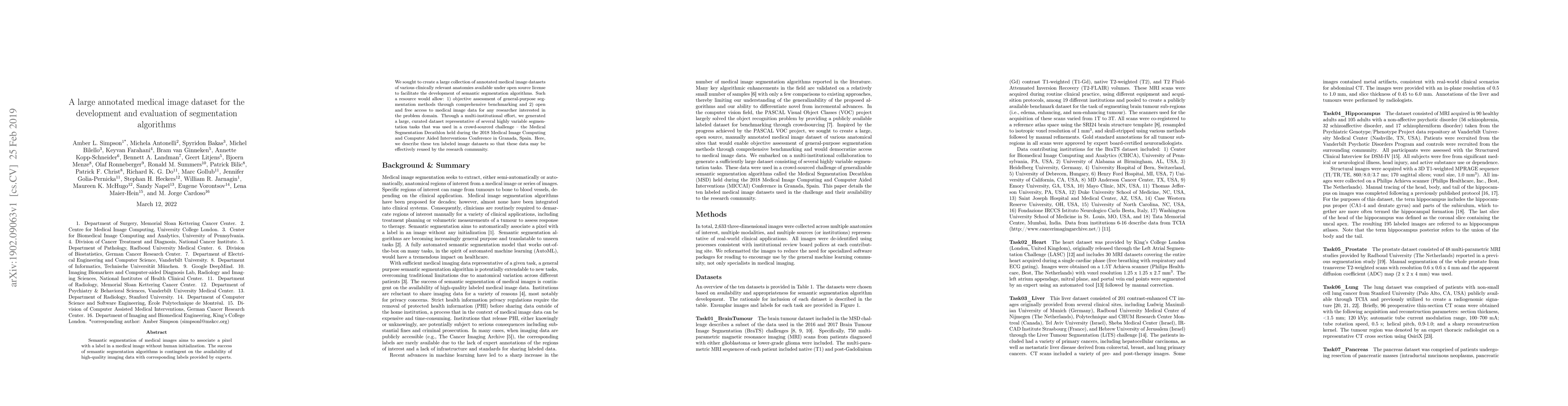 This paper presents a large, annotated medical image dataset created to support the development and evaluation of semantic segmentation algorithms, aiming to provide objective benchmarking and open access to diverse, clinically relevant anatomical data for researchers. The dataset was used in the Medical Segmentation Decathlon challenge and comprises ten labeled datasets for various segmentation tasks.