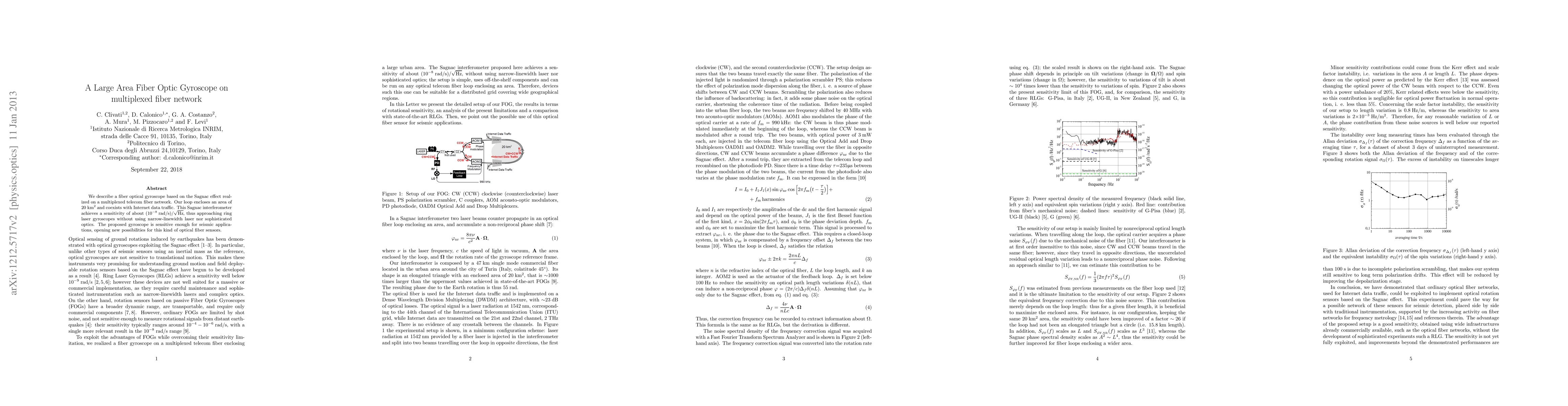 This paper presents a large-area fiber optic gyroscope based on the Sagnac effect, operating on a multiplexed telecom fiber network over 20 km^2. It achieves high sensitivity of 1e-8 (rad/s)/sqrt(Hz), comparable to ring laser gyroscopes, and is suitable for seismic applications.