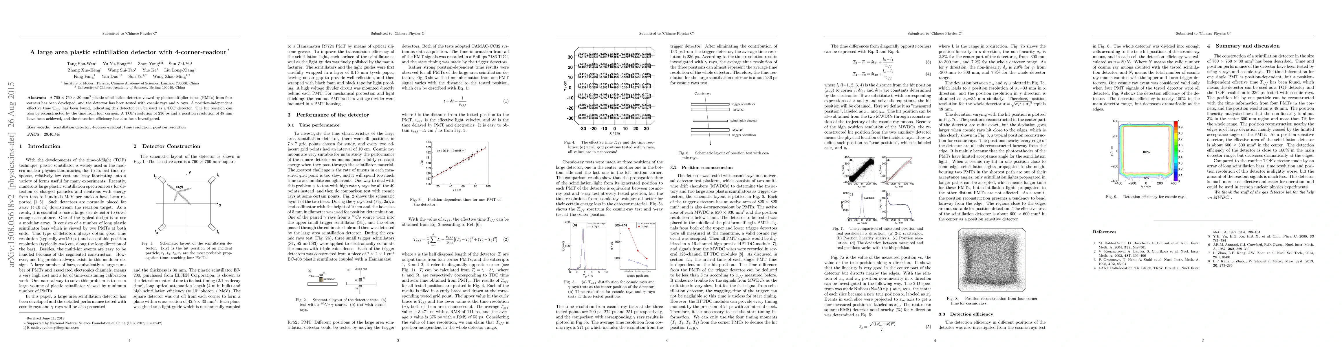 A large 760 $\times$ 760 $\times$ 30 mm$^3$ plastic scintillation detector with 4-corner readout was developed and tested for cosmic rays and $\gamma$ rays. It demonstrates effective time resolution and position reconstruction, achieving a TOF resolution of 236 ps and a position resolution of 48 mm.