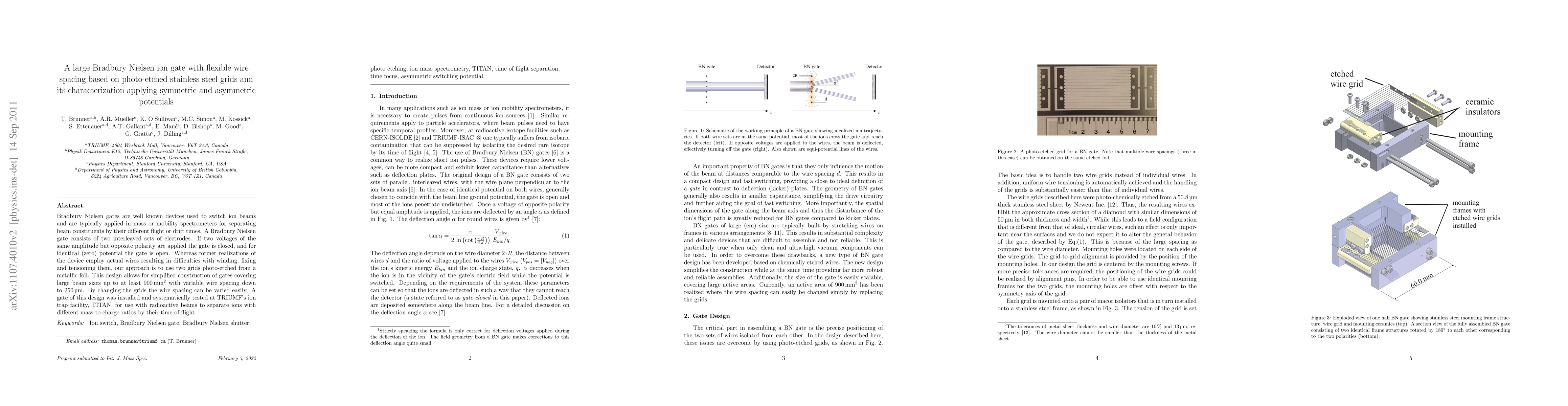 Bradbury Nielsen gates are well known devices used to switch ion beams and are typically applied in mass or mobility spectrometers for separating beam constituents by their different flight or drift times. A Bradbury Nielsen gate consists of two interleaved sets of electrodes. If two voltages of the same amplitude but opposite polarity are applied the gate is closed, and for identical (zero) potential the gate is open. Whereas former realizations of the device employ actual wires resulting in difficulties with winding, fixing and tensioning them, our approach is to use two grids photo-etched from a metallic foil. This design allows for simplified construction of gates covering large beam sizes up to at least 900\,mm$^2$ with variable wire spacing down to 250\,\textmu m. By changing the grids the wire spacing can be varied easily. A gate of this design was installed and systematically tested at TRIUMF's ion trap facility, TITAN, for use with radioactive beams to separate ions with different mass-to-charge ratios by their time-of-flight.