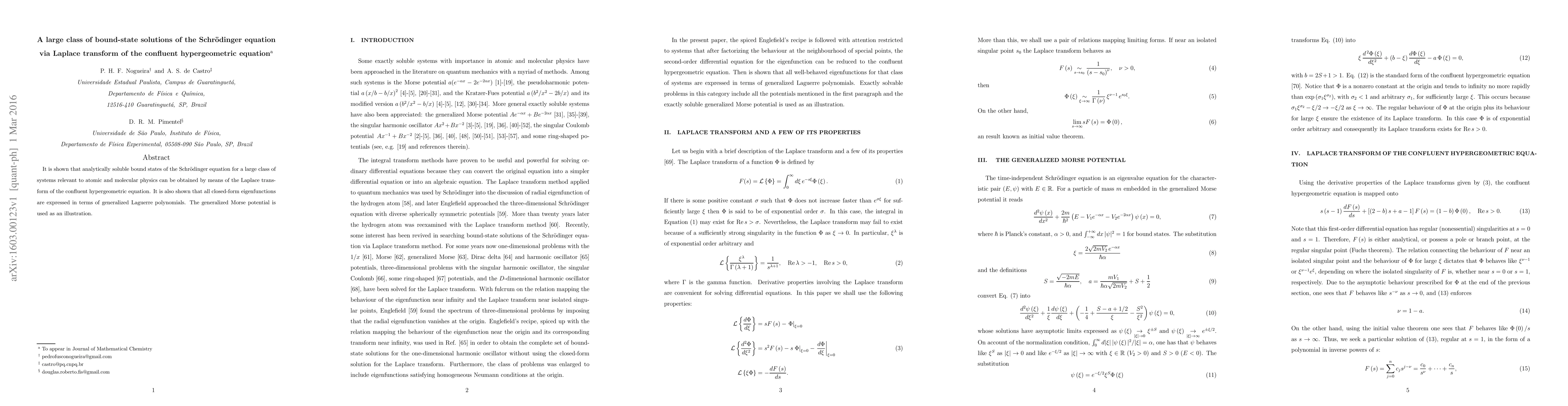 It is shown that analytically soluble bound states of the Schr\"odinger equation for a large class of systems relevant to atomic and molecular physics can be obtained by means of the Laplace transform of the confluent hypergeometric equation. It is also shown that all closed-form eigenfunctions are expressed in terms of generalized Laguerre polynomials. The generalized Morse potential is used as an illustration.