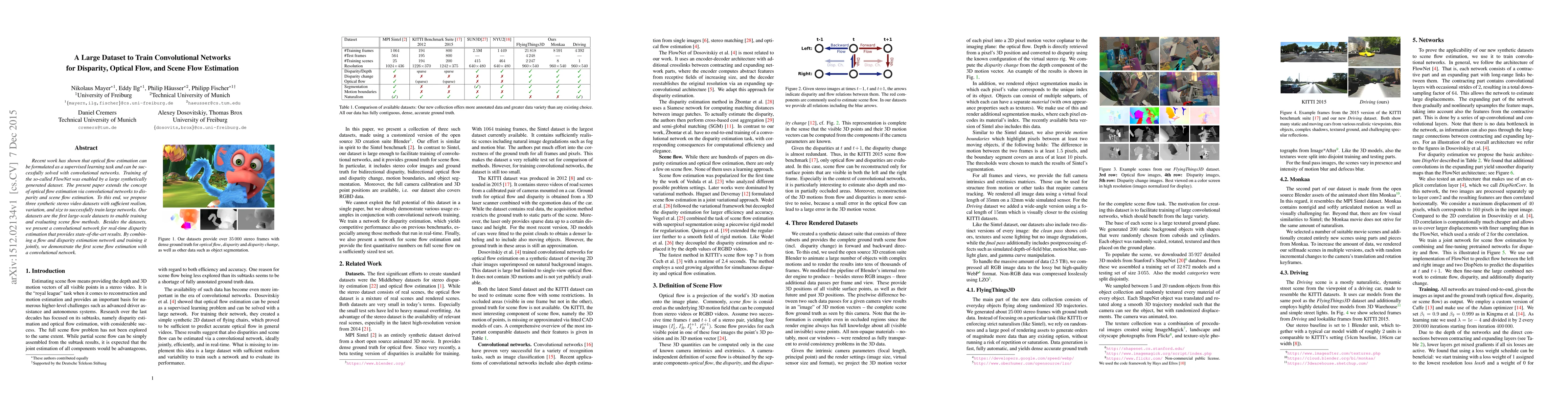 This paper introduces three large synthetic stereo video datasets for training convolutional networks in disparity, optical flow, and scene flow estimation. It also presents a state-of-the-art convolutional network for real-time disparity estimation and demonstrates the first joint convolutional network for scene flow estimation.