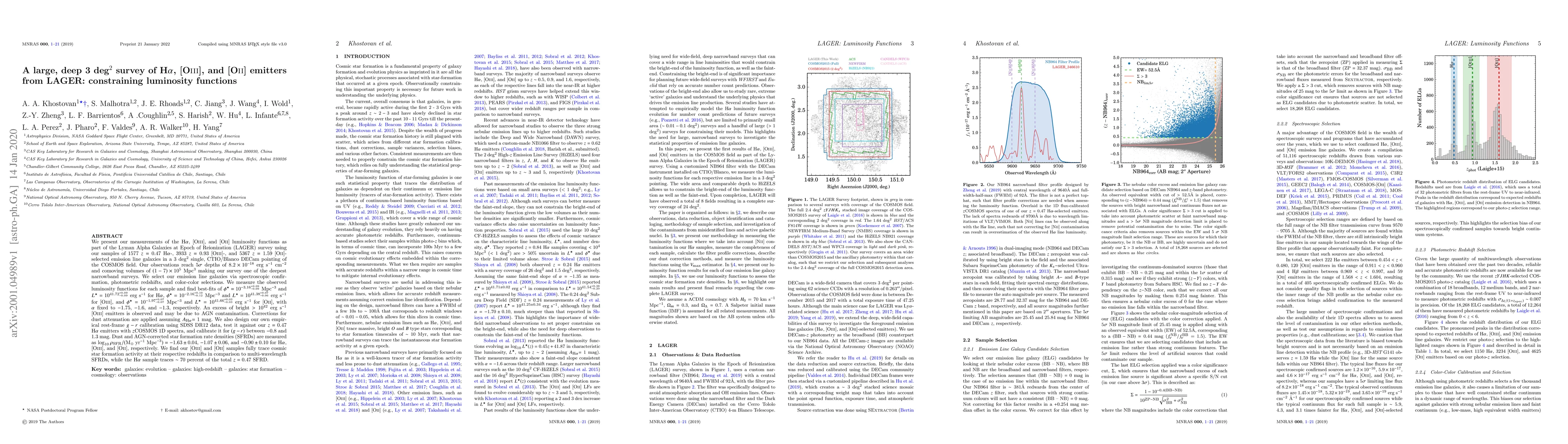 We present our measurements of the H$\alpha$, [OIII], and [OII] luminosity functions as part of the Lyman Alpha Galaxies at Epoch of Reionization (LAGER) survey using our samples of 1577 $z = 0.47$ H$\alpha$-, 3933 $z = 0.93$ [OIII]-, and 5367 $z = 1.59$ [OII]-selected emission line galaxies in a single 3 deg$^2$ CTIO/Blanco DECam pointing of the COSMOS field. Our observations reach 5$\sigma$ depths of $8.2\times10^{-18}$ erg s$^{-1}$ cm$^{-2}$ and comoving volumes of $(1-7)\times10^{5}$ Mpc$^3$ making our survey one of the deepest narrowband surveys. We measure the observed luminosity functions and find best-fits of $\phi^\star = 10^{-3.16\pm0.09}$ Mpc$^{-3}$ and $L^\star = 10^{41.72\pm0.09}$ erg s$^{-1}$ for H$\alpha$, $\phi^\star = 10^{-2.16^{+0.10}_{-0.12}}$ Mpc$^{-3}$ and $L^\star = 10^{41.38^{+0.07}_{-0.06}}$ erg s$^{-1}$ for [OIII], and $\phi^\star = 10^{-1.97^{+0.07}_{-0.07}}$ Mpc$^{-3}$ and $L^\star = 10^{41.66\pm0.03}$ erg s$^{-1}$ for [OII], with $\alpha$ fixed to $-1.75$, $-1.6$, and $-1.3$, respectively. An excess of bright $> 10^{42}$ erg s$^{-1}$ [OIII] emitters is observed and may be due to AGN contamination. Dust corrections are applied assuming $A_{\rm{H}\alpha} = 1$ mag. We also design our own empirical rest-frame $g - r$ calibration using SDSS DR12 data, test it against our $z = 0.47$ H$\alpha$ emitters with $z$COSMOS $1$D spectra, and calibrate it for $(g - r)$ between $-0.8$ and $1.3$ mag. Dust and AGN-corrected star formation rate densities (SFRDs) are measured as $\log_{10}\rho_{\rm{SFR}}/(\rm{M}_\odot\ \rm{yr}^{-1}\ \rm{Mpc}^{-3}) = -1.63\pm0.04$, $-1.07\pm0.06$, and $-0.90\pm0.10$ for H$\alpha$, [OIII], and [OII], respectively. We find our [OIII] and [OII] samples fully trace cosmic star formation activity at their respective redshifts in comparison to multi-wavelength SFRDs, while the H$\alpha$ sample traces $\sim 70$ percent of the total $z = 0.47$ SFRD.