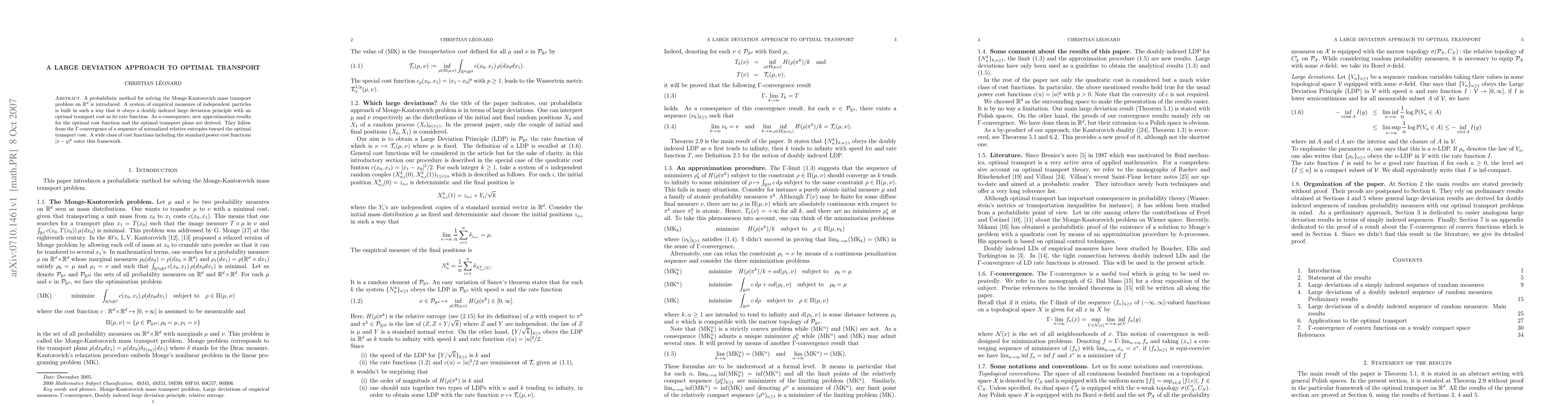 This paper introduces a probabilistic method for solving the Monge-Kantorovich mass transport problem using large deviation principles, leading to new approximation results for optimal transport costs and plans via Gamma-convergence of normalized relative entropies. The framework accommodates a broad range of cost functions, including power costs.