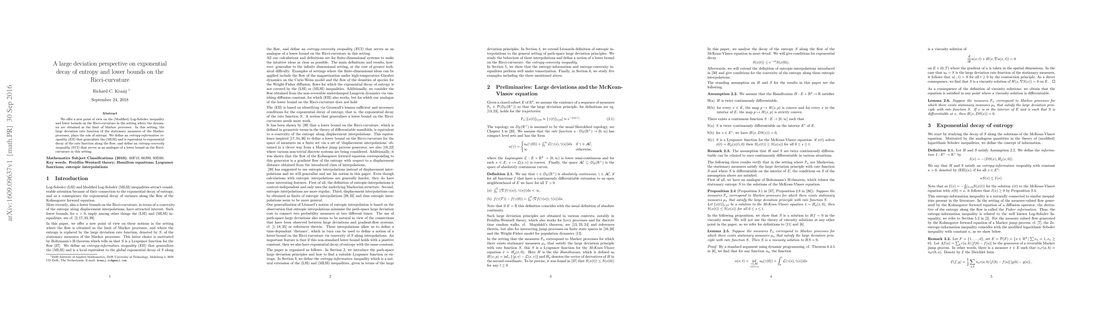 We offer a new point of view on the (Modified) Log-Sobolev inequality and lower bounds on the Ricci-curvature in the setting where the dynamics are obtained as the limit of Markov processes. In this setting, the large deviation rate function of the stationary measures of the Markov processes, plays the role of entropy. We define an entropy-information inequality (EII) that generalizes the (MLSI) and is equivalent to exponential decay of the rate function along the flow, and define an entropy-convexity inequality (ECI) that serves as an analogue of a lower bound on the Ricci-curvature in this setting.