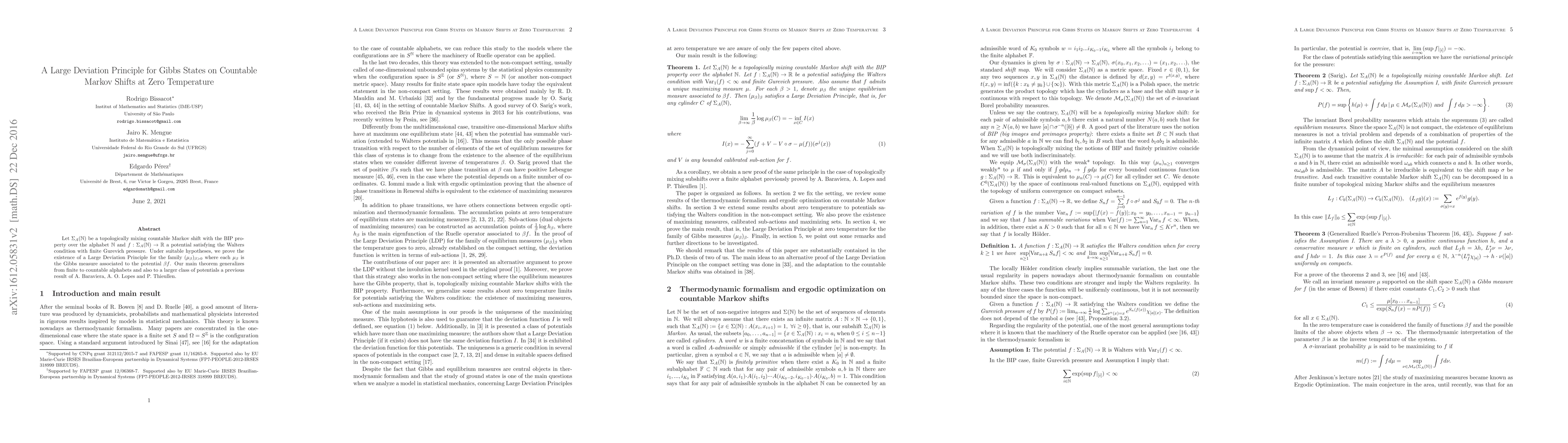 This paper establishes a Large Deviation Principle for Gibbs states on countable Markov shifts at zero temperature, generalizing from finite to countable alphabets and a broader class of potentials, with implications for understanding probabilistic behavior in these systems.