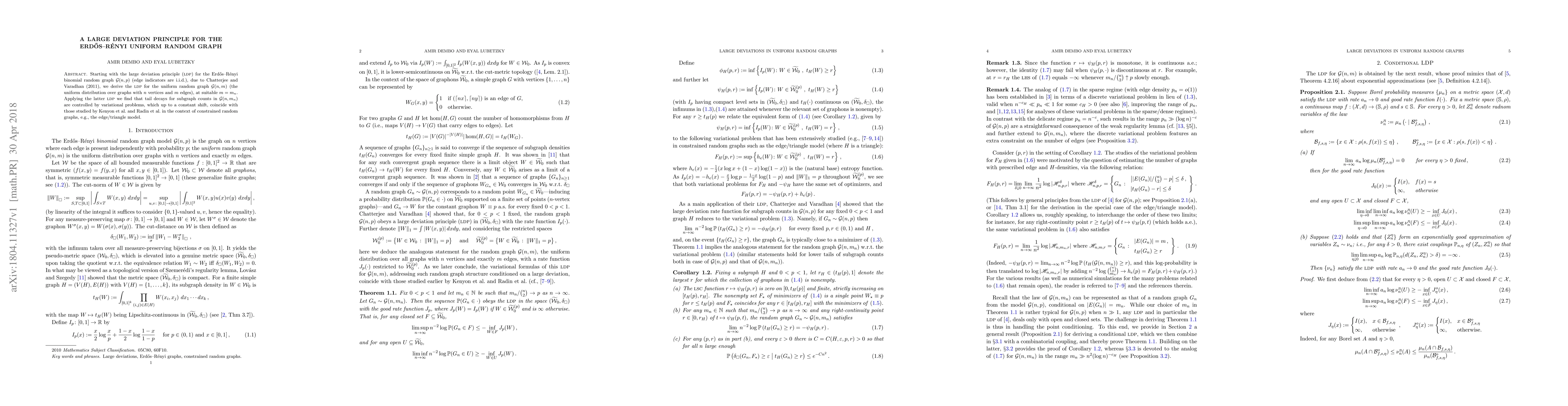 Researchers derive a large deviation principle for uniform random graphs, finding that tail decays for subgraph counts can be controlled by variational problems similar to those studied in constrained random graphs.