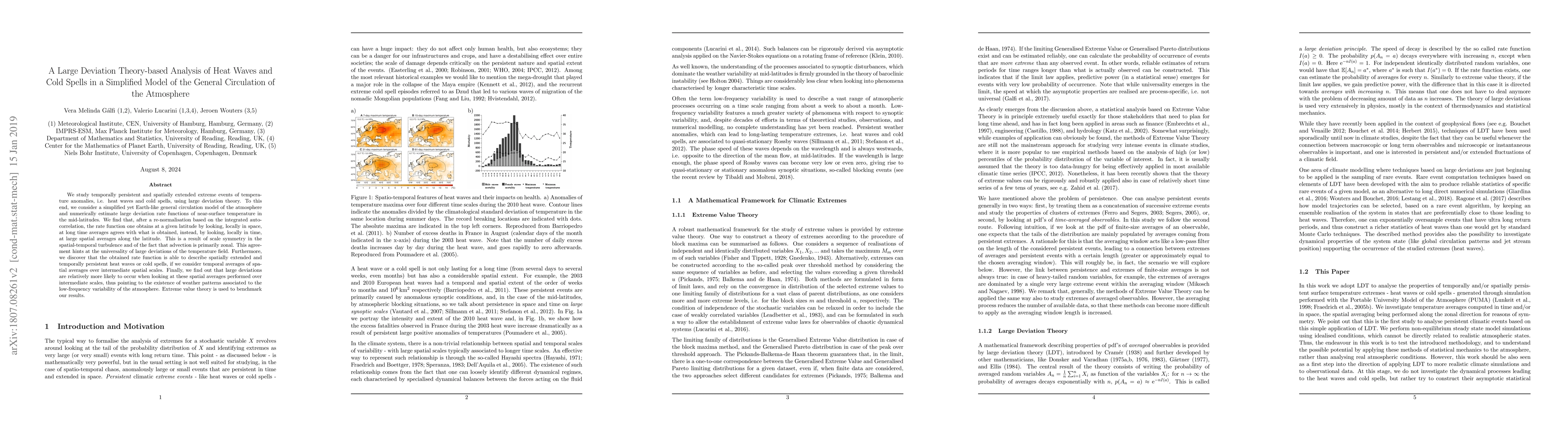 This paper employs large deviation theory to analyze heat waves and cold spells in a simplified atmospheric model, finding that the rate function for large deviations is consistent across different spatial and temporal scales due to scale symmetry and zonal advection. The study reveals that large deviations are more likely at intermediate spatial scales, indicating a connection to low-frequency atmospheric variability.