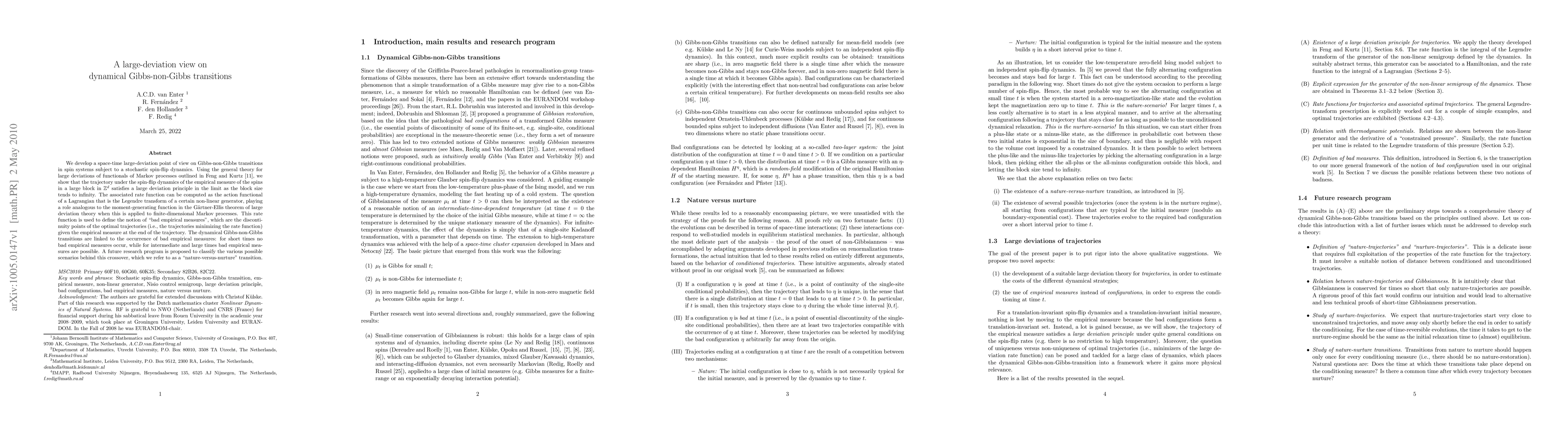 We develop a space-time large-deviation point of view on Gibbs-non-Gibbs transitions in spin systems subject to a stochastic spin-flip dynamics. Using the general theory for large deviations of functionals of Markov processes outlined in Feng and Kurtz [11], we show that the trajectory under the spin-flip dynamics of the empirical measure of the spins in a large block in Z^d satisfies a large deviation principle in the limit as the block size tends to infinity. The associated rate function can be computed as the action functional of a Lagrangian that is the Legendre transform of a certain non-linear generator, playing a role analogous to the moment-generating function in the Gartner-Ellis theorem of large deviation theory when this is applied to finite-dimensional Markov processes. This rate function is used to define the notion of "bad empirical measures", which are the discontinuity points of the optimal trajectories (i.e., the trajectories minimizing the rate function) given the empirical measure at the end of the trajectory. The dynamical Gibbs-non-Gibbs transitions are linked to the occurrence of bad empirical measures: for short times no bad empirical measures occur, while for intermediate and large times bad empirical mea- sures are possible. A future research program is proposed to classify the various possible scenarios behind this crossover, which we refer to as a "nature-versus-nurture" transition.