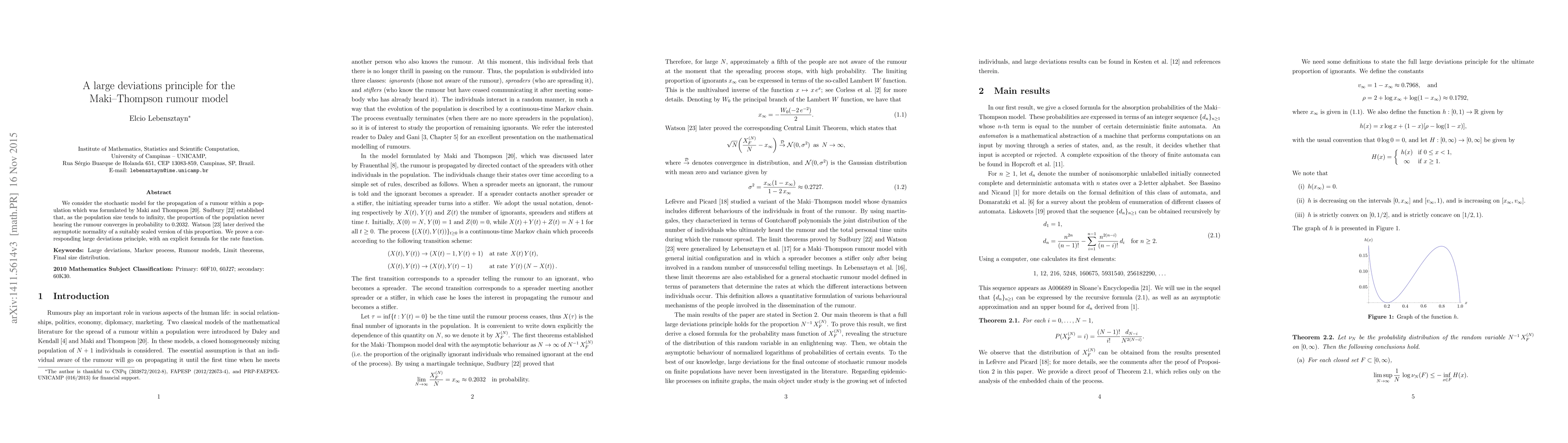We consider the stochastic model for the propagation of a rumour within a population which was formulated by Maki and Thompson. Sudbury established that, as the population size tends to infinity, the proportion of the population never hearing the rumour converges in probability to $0.2032$. Watson later derived the asymptotic normality of a suitably scaled version of this proportion. We prove a corresponding large deviations principle, with an explicit formula for the rate function.