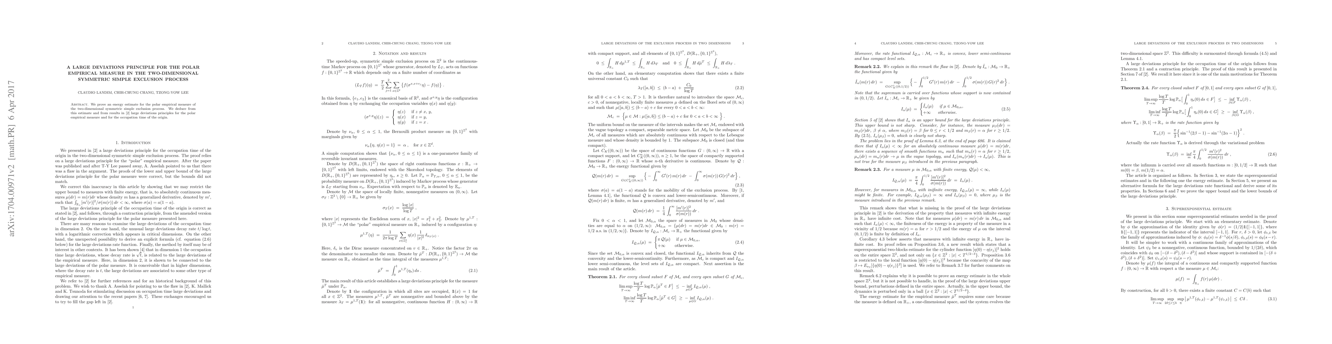 Summary: This paper establishes an energy estimate for the polar empirical measure in the two-dimensional symmetric simple exclusion process, and uses this estimate along with prior results to derive large deviations principles for the polar empirical measure and the occupation time of the origin.