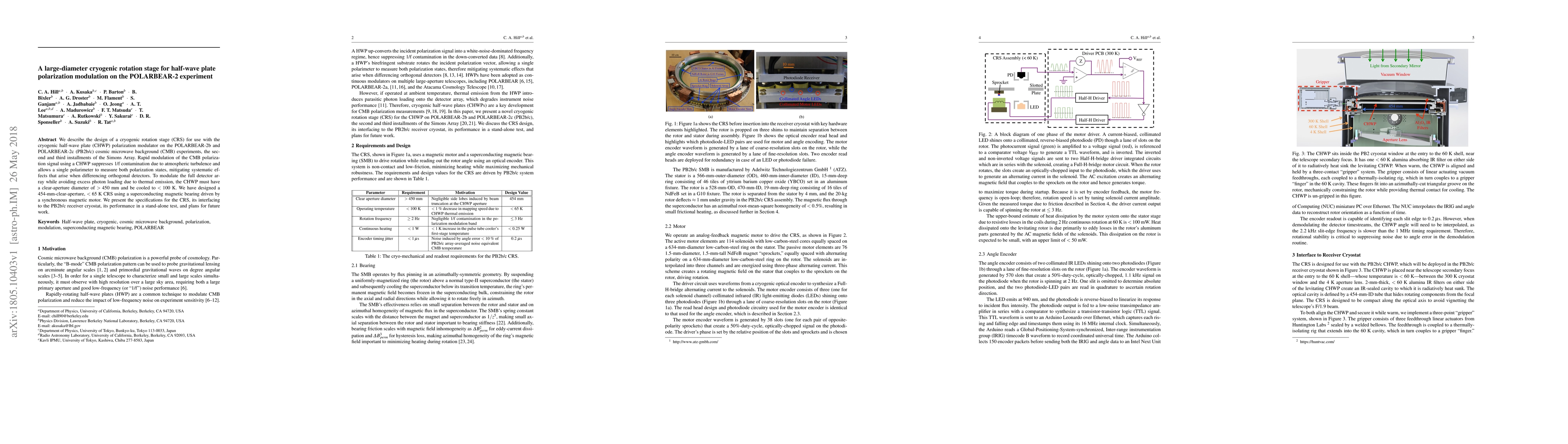 We describe the design of a cryogenic rotation stage (CRS) for use with the cryogenic half-wave plate (CHWP) polarization modulator on the POLARBEAR-2b and POLARBEAR-2c (PB2b/c) cosmic microwave background (CMB) experiments, the second and third installments of the Simons Array. Rapid modulation of the CMB polarization signal using a CHWP suppresses 1/f contamination due to atmospheric turbulence and allows a single polarimeter to measure both polarization states, mitigating systematic effects that arise when differencing orthogonal detectors. To modulate the full detector array while avoiding excess photon loading due to thermal emission, the CHWP must have a clear-aperture diameter of > 450 mm and be cooled to < 100 K. We have designed a 454-mm-clear-aperture, < 65 K CRS using a superconducting magnetic bearing driven by a synchronous magnetic motor. We present the specifications for the CRS, its interfacing to the PB2b/c receiver cryostat, its performance in a stand-alone test, and plans for future work.