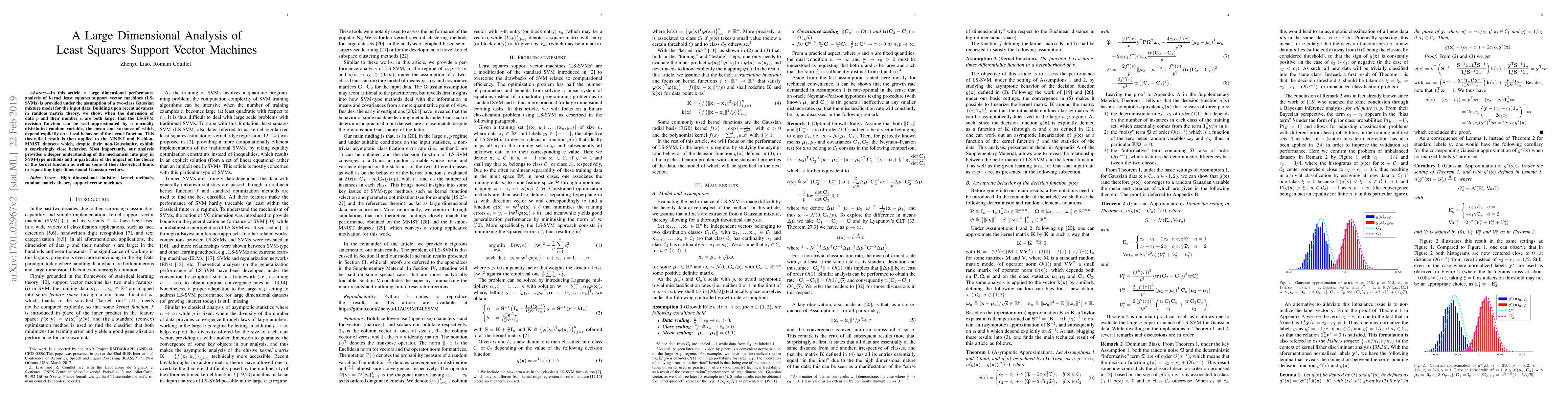 This paper analyzes the performance of kernel least squares support vector machines (LS-SVMs) in high dimensions using random matrix theory, showing that the LS-SVM decision function approximates a normally distributed variable dependent on the kernel function's local behavior. The findings are validated on non-Gaussian MNIST and Fashion-MNIST datasets, revealing insights into SVM mechanisms and kernel function impacts.