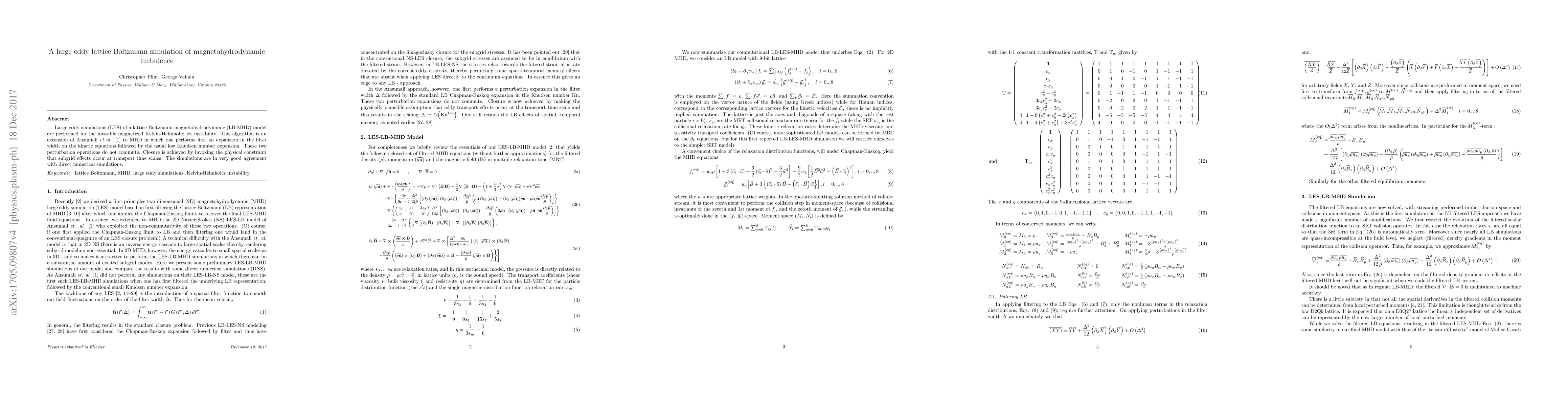 This paper presents large eddy simulations using a lattice Boltzmann magnetohydrodynamic (LB-MHD) model to study the unstable magnetized Kelvin-Helmholtz jet instability, with good agreement to direct numerical simulations. The method extends previous work by incorporating non-commutative perturbation expansions and enforcing closure through transport time scales.