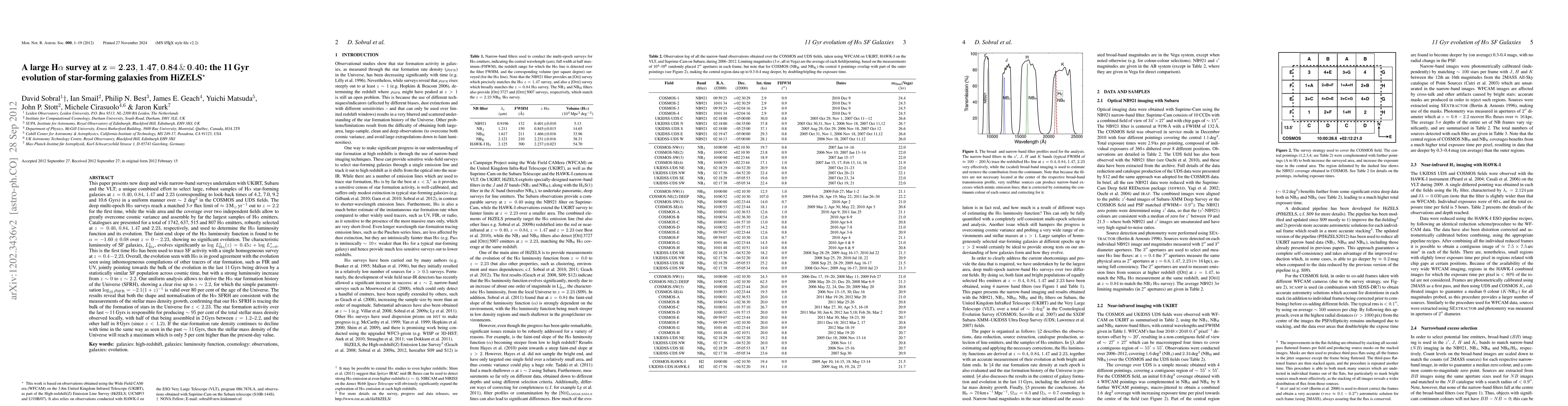 This paper presents new deep and wide narrow-band surveys undertaken with UKIRT, Subaru and the VLT; a combined effort to select large, robust samples of H-alpha (Ha) emitters at z=0.40, 0.84, 1.47 and 2.23 (corresponding to look-back times of 4.2, 7.0, 9.2 and 10.6 Gyrs) in a uniform manner over ~2 deg^2 in the COSMOS and UDS fields. The deep Ha surveys reach ~3M_sun/yr out to z=2.2 for the first time, while the wide area and the coverage over two independent fields allow to greatly overcome cosmic variance. A total of 1742, 637, 515 and 807 Ha emitters are homogeneously selected at z=0.40, 0.84, 1.47 and 2.23, respectively, and used to determine the Ha luminosity function and its evolution. The faint-end slope is found to be -1.60+-0.08 over z=0-2.23, showing no evolution. The characteristic luminosity of SF galaxies, L*, evolves significantly as log[L*(z)]=0.45z+log[L*(z=0)]. This is the first time Ha has been used to trace SF activity with a single homogeneous survey at z=0.4-2.23. Overall, the evolution seen in Ha is in good agreement with the evolution seen using inhomogeneous compilations of other tracers of star formation, such as FIR and UV, jointly pointing towards the bulk of the evolution in the last 11 Gyrs being driven by a strong luminosity increase from z~0 to z~2.2. Our uniform analysis reveals an Ha star formation history of the Universe which can be simply parameterised by log(SFRD)=-2.1/(1+z) for z<2.23. Both the shape and normalisation of the Ha star formation history are consistent with the measurements of the stellar mass density growth, confirming that our Ha analysis traces the bulk of the formation of stars in the Universe up to z~2.2. Star formation activity since z~2.2 is responsible for ~95% of the total stellar mass density observed locally today (with half being assembled between z=1.2-2.2, and the rest since z<1.2).
