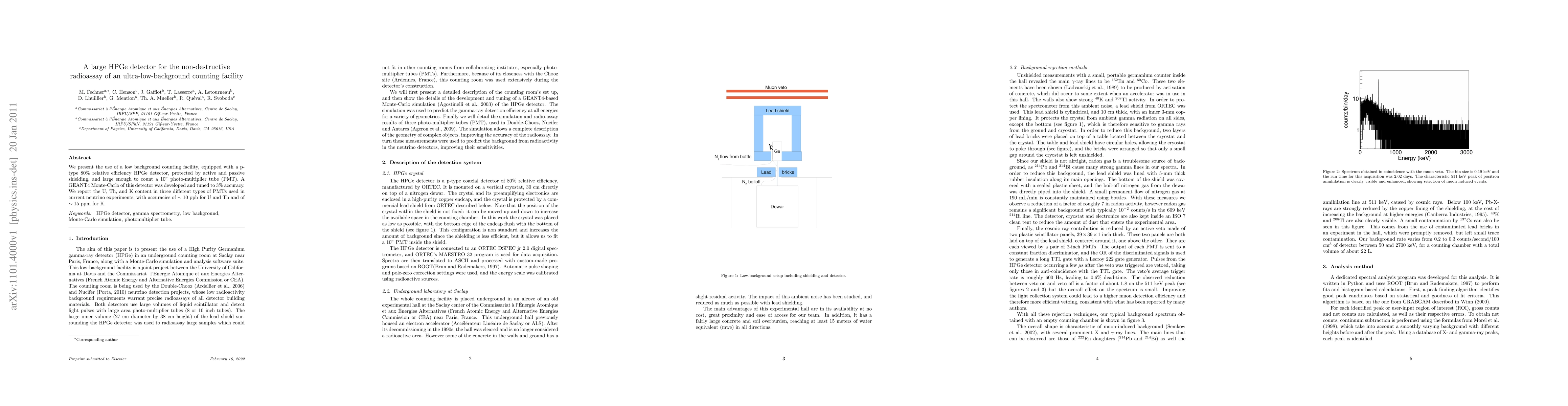 This paper describes a large HPGe detector in a low-background facility for radioassay, achieving precise measurements of U, Th, and K in PMTs used in neutrino experiments, with accuracies of 10 ppb for U and Th and 15 ppm for K. The detector's performance was validated using a GEANT4 Monte-Carlo simulation.