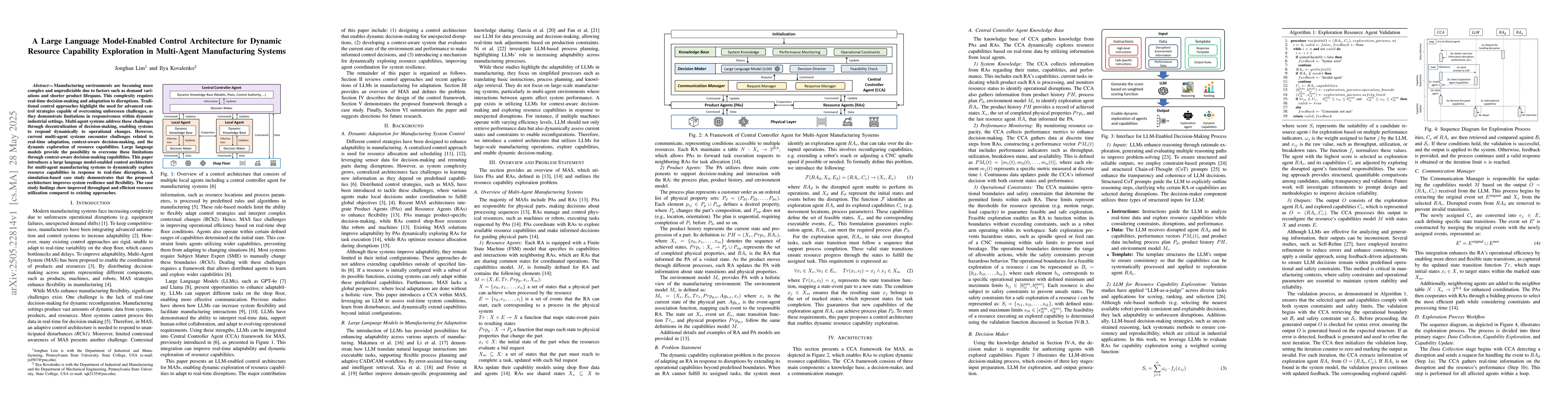 The paper introduces a large language model-enabled control architecture for multi-agent manufacturing systems, focusing on dynamic resource capability exploration in response to real-time disruptions.