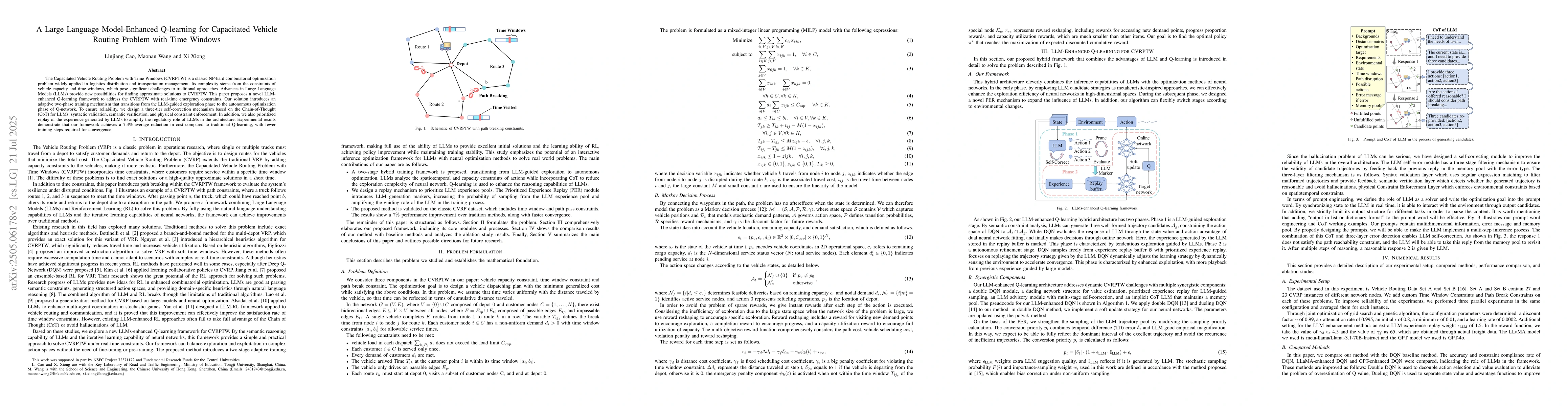The Capacitated Vehicle Routing Problem with Time Windows (CVRPTW) is a classic NP-hard combinatorial optimization problem widely applied in logistics distribution and transportation management. Its complexity stems from the constraints of vehicle capacity and time windows, which pose significant challenges to traditional approaches. Advances in Large Language Models (LLMs) provide new possibilities for finding approximate solutions to CVRPTW. This paper proposes a novel LLM-enhanced Q-learning framework to address the CVRPTW with real-time emergency constraints. Our solution introduces an adaptive two-phase training mechanism that transitions from the LLM-guided exploration phase to the autonomous optimization phase of Q-network. To ensure reliability, we design a three-tier self-correction mechanism based on the Chain-of-Thought (CoT) for LLMs: syntactic validation, semantic verification, and physical constraint enforcement. In addition, we also prioritized replay of the experience generated by LLMs to amplify the regulatory role of LLMs in the architecture. Experimental results demonstrate that our framework achieves a 7.3\% average reduction in cost compared to traditional Q-learning, with fewer training steps required for convergence.