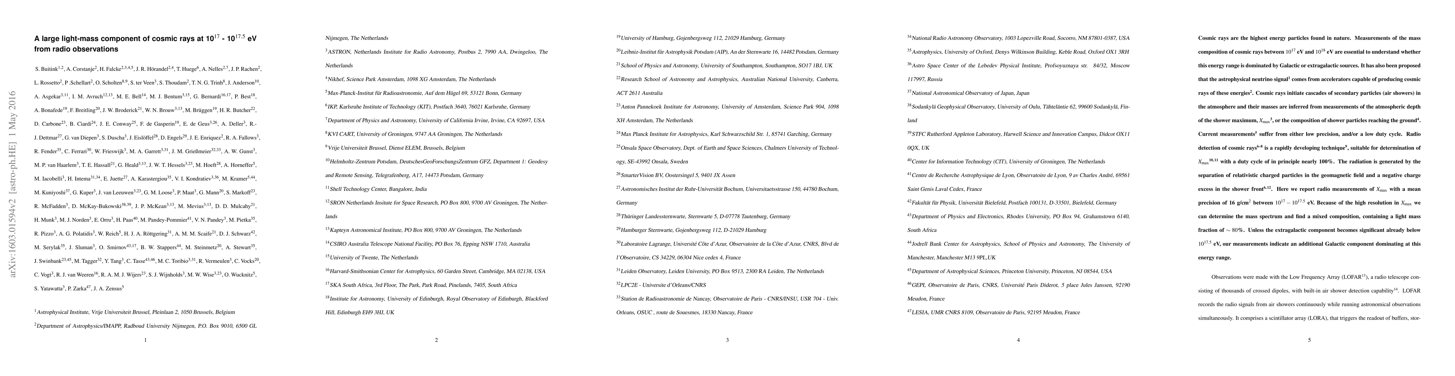 Cosmic rays are the highest energy particles found in nature. Measurements of the mass composition of cosmic rays between 10^{17} eV and 10^{18} eV are essential to understand whether this energy range is dominated by Galactic or extragalactic sources. It has also been proposed that the astrophysical neutrino signal comes from accelerators capable of producing cosmic rays of these energies. Cosmic rays initiate cascades of secondary particles (air showers) in the atmosphere and their masses are inferred from measurements of the atmospheric depth of the shower maximum, Xmax, or the composition of shower particles reaching the ground. Current measurements suffer from either low precision, or a low duty cycle and a high energy threshold. Radio detection of cosmic rays is a rapidly developing technique, suitable for determination of Xmax with a duty cycle of in principle nearly 100%. The radiation is generated by the separation of relativistic charged particles in the geomagnetic field and a negative charge excess in the shower front. Here we report radio measurements of Xmax with a mean precision of 16 g/cm^2 between 10^{17}-10^{17.5} eV. Because of the high resolution in $Xmax we can determine the mass spectrum and find a mixed composition, containing a light mass fraction of ~80%. Unless the extragalactic component becomes significant already below 10^{17.5} eV, our measurements indicate an additional Galactic component dominating at this energy range.