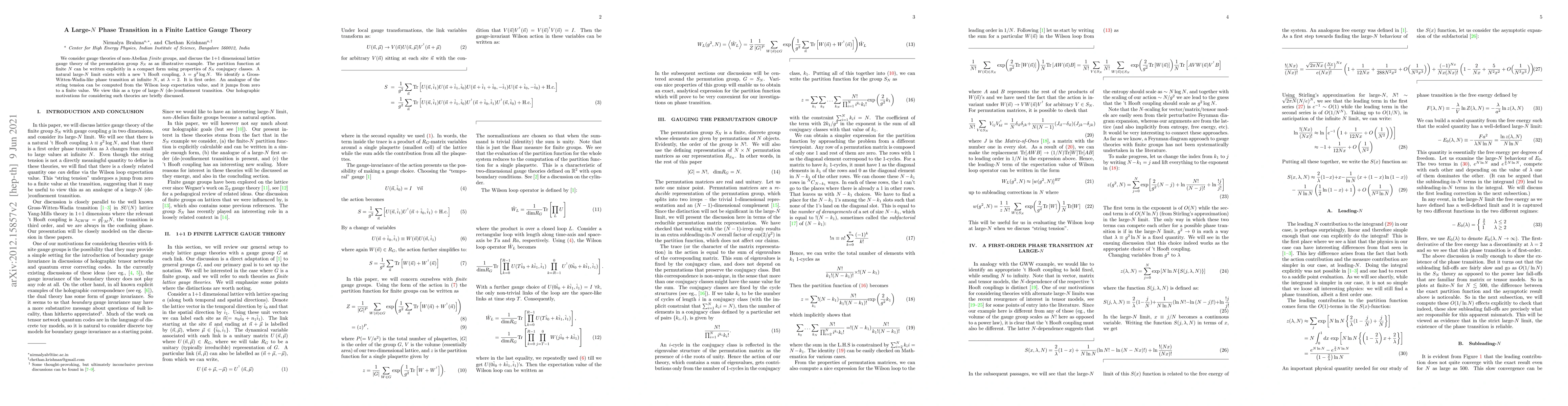 We consider gauge theories of non-Abelian $finite$ groups, and discuss the 1+1 dimensional lattice gauge theory of the permutation group $S_N$ as an illustrative example. The partition function at finite $N$ can be written explicitly in a compact form using properties of $S_N$ conjugacy classes. A natural large-$N$ limit exists with a new 't Hooft coupling, $\lambda=g^2 \log N$. We identify a Gross-Witten-Wadia-like phase transition at infinite $N$, at $\lambda=2$. It is first order. An analogue of the string tension can be computed from the Wilson loop expectation value, and it jumps from zero to a finite value. We view this as a type of large-$N$ (de-)confinement transition. Our holographic motivations for considering such theories are briefly discussed.