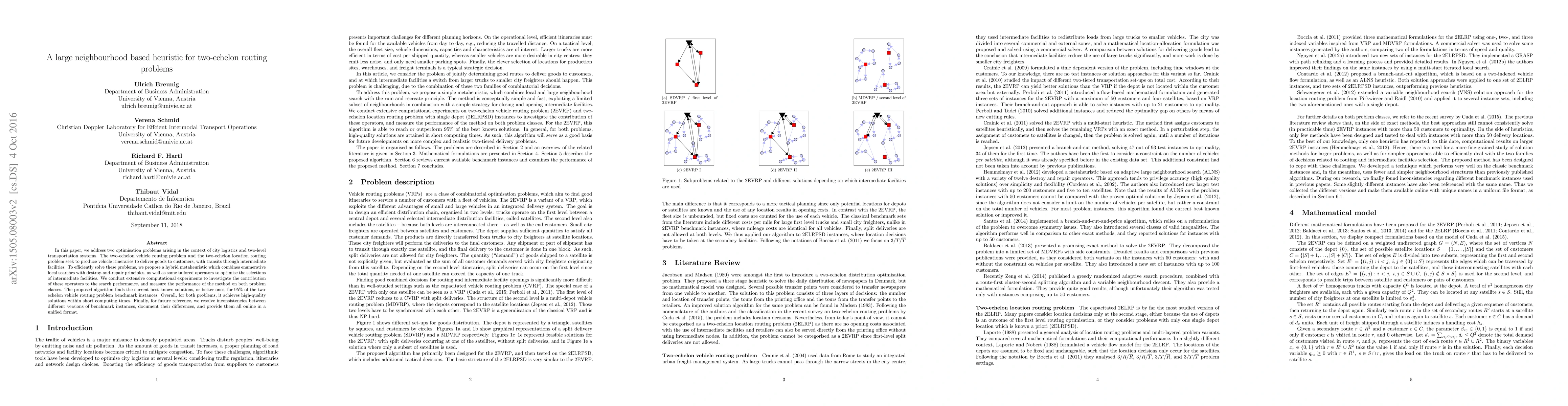 This paper proposes a hybrid metaheuristic to solve two-echelon routing problems in city logistics, combining local search and tailored operators for intermediate facility selection. The algorithm achieves best-known or better solutions for 95% of benchmark instances, resolving inconsistencies and providing a unified online repository of problem data.
