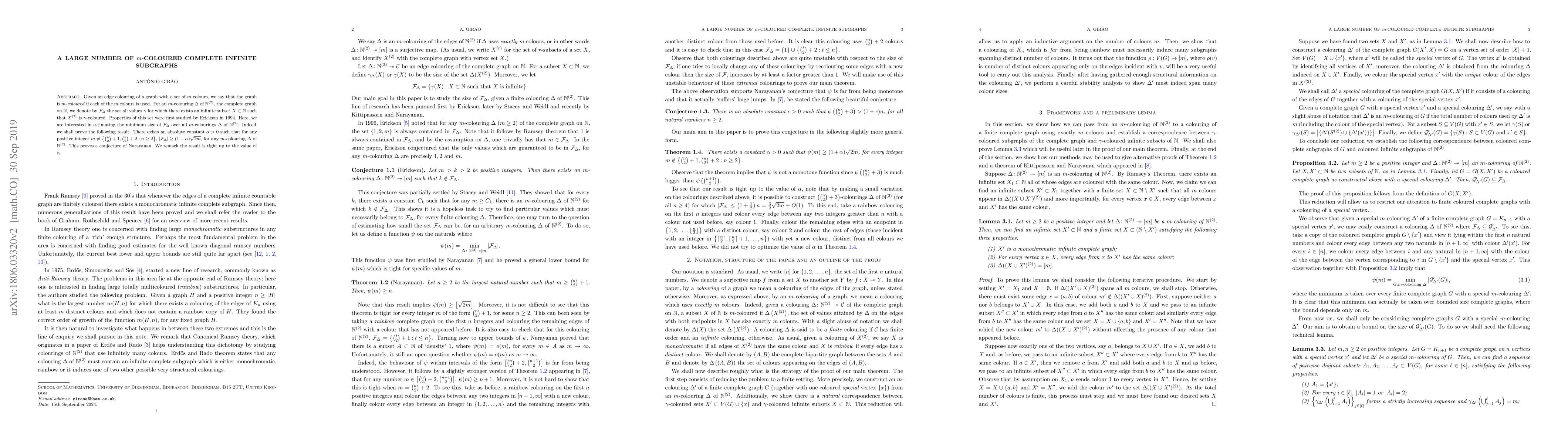 Given an edge colouring of a graph with a set of $m$ colours, we say that the graph is $m$-\textit{coloured} if each of the $m$ colours is used. For an $m$-colouring $\Delta$ of $\mathbb{N}^{(2)}$, the complete graph on $\mathbb{N}$, we denote by $\mathcal{F}_{\Delta}$ the set all values $\gamma$ for which there exists an infinite subset $X\subset \mathbb{N}$ such that $X^{(2)}$ is $\gamma$-coloured. Properties of this set were first studied by Erickson in $1994$. Here, we are interested in estimating the minimum size of $\mathcal{F}_{\Delta}$ over all $m$-colourings $\Delta$ of $\mathbb{N}^{(2)}$. Indeed, we shall prove the following result. There exists an absolute constant $\alpha > 0$ such that for any positive integer $m \neq \left\{ {n \choose 2}+1, {n \choose 2}+2: n\geq 2\right\}$, $|\mathcal{F}_{\Delta}| \geq (1+\alpha)\sqrt{2m}$, for any $m$-colouring $\Delta$ of $\mathbb{N}^{(2)}$, thus proving a conjecture of Narayanan. This result is tight up to the order of the constant $\alpha$.