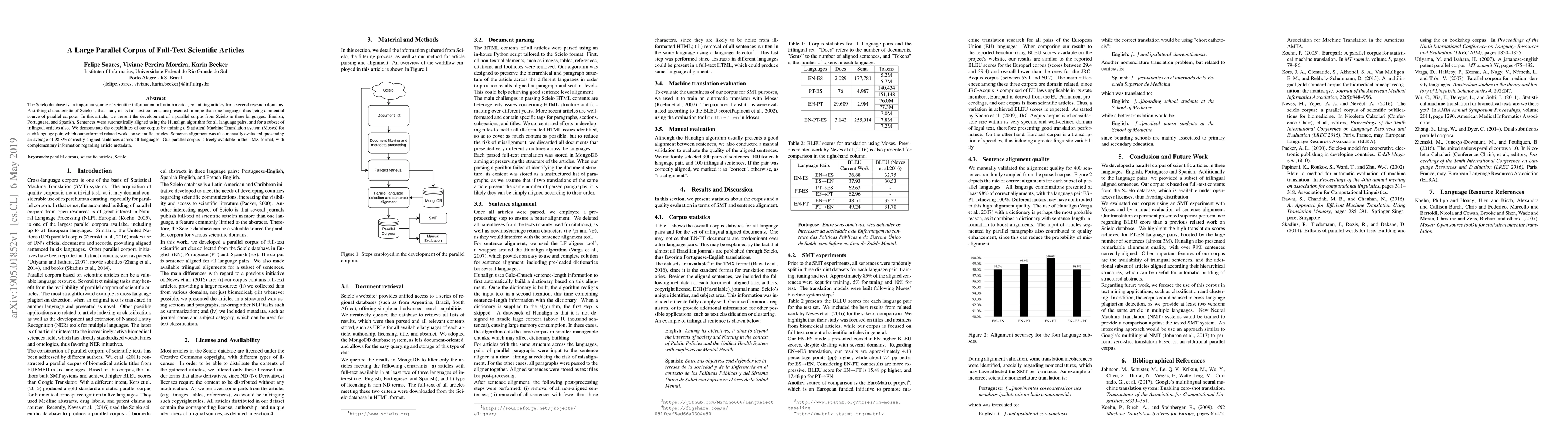 This paper develops a large parallel corpus from Scielo's multilingual scientific articles, aligning sentences using Hunalign and manually evaluating alignment accuracy at 98.8%. The corpus enables a Statistical Machine Translation system that outperforms related works, demonstrating its utility for scientific translation.