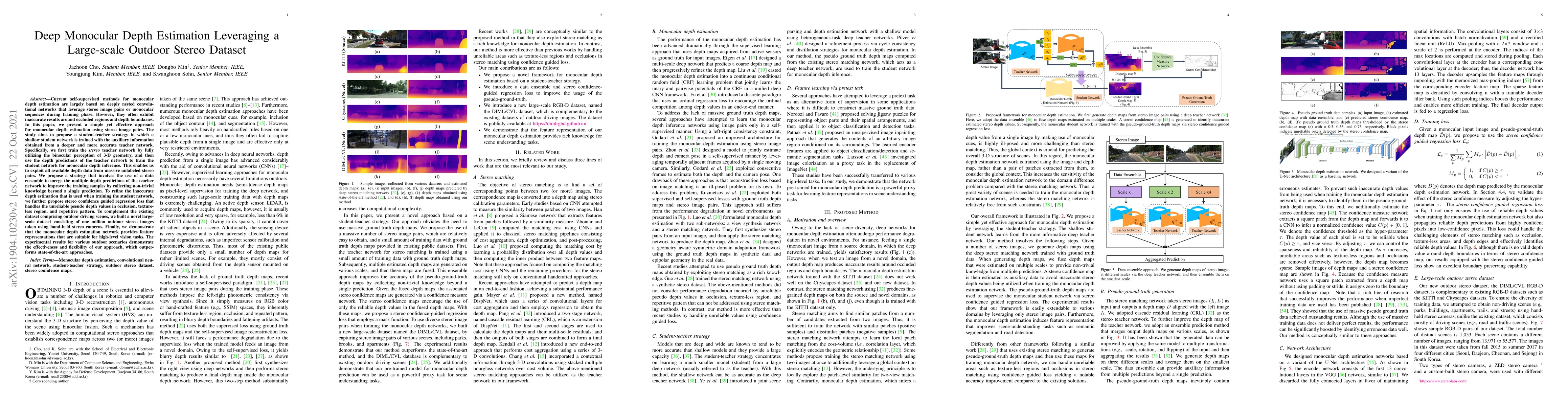 Current self-supervised methods for monocular depth estimation are largely based on deeply nested convolutional networks that leverage stereo image pairs or monocular sequences during a training phase. However, they often exhibit inaccurate results around occluded regions and depth boundaries. In this paper, we present a simple yet effective approach for monocular depth estimation using stereo image pairs. The study aims to propose a student-teacher strategy in which a shallow student network is trained with the auxiliary information obtained from a deeper and more accurate teacher network. Specifically, we first train the stereo teacher network by fully utilizing the binocular perception of 3-D geometry and then use the depth predictions of the teacher network to train the student network for monocular depth inference. This enables us to exploit all available depth data from massive unlabeled stereo pairs. We propose a strategy that involves the use of a data ensemble to merge the multiple depth predictions of the teacher network to improve the training samples by collecting non-trivial knowledge beyond a single prediction. To refine the inaccurate depth estimation that is used when training the student network, we further propose stereo confidence-guided regression loss that handles the unreliable pseudo depth values in occlusion, texture-less region, and repetitive pattern. To complement the existing dataset comprising outdoor driving scenes, we built a novel large-scale dataset consisting of one million outdoor stereo images taken using hand-held stereo cameras. Finally, we demonstrate that the monocular depth estimation network provides feature representations that are suitable for high-level vision tasks. The experimental results for various outdoor scenarios demonstrate the effectiveness and flexibility of our approach, which outperforms state-of-the-art approaches.