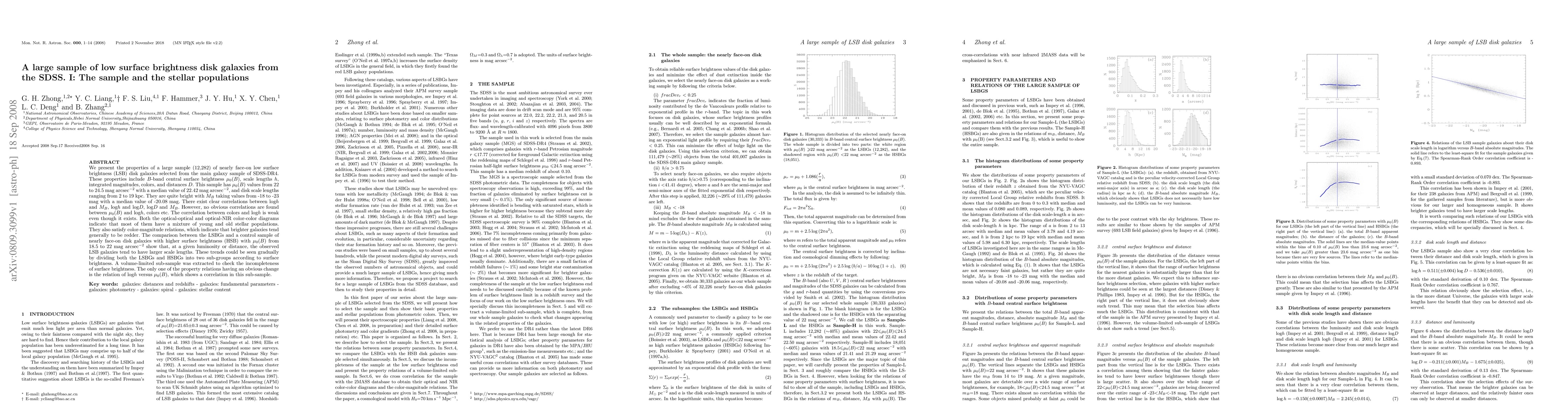 A large sample of 12,282 low surface brightness disk galaxies was analyzed for their properties, revealing correlations between scale lengths and luminosity, as well as a trend where brighter galaxies tend to be redder.