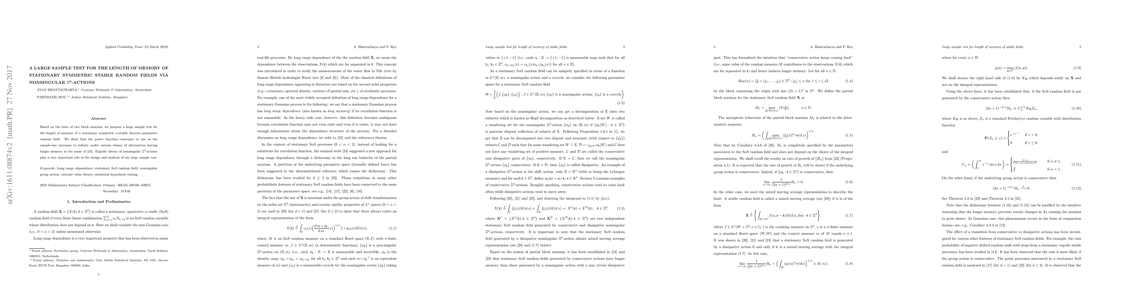 Based on the ratio of two block maxima, we propose a large sample test for the length of memory of a stationary symmetric $\alpha$-stable discrete parameter random field. We show that the power function converges to one as the sample-size increases to infinity under various classes of alternatives having longer memory in the sense of Samorodnitsky(2004). Ergodic theory of nonsingular $\mathbb{Z}^d$-actions play a very important role in the design and analysis of our large sample test.