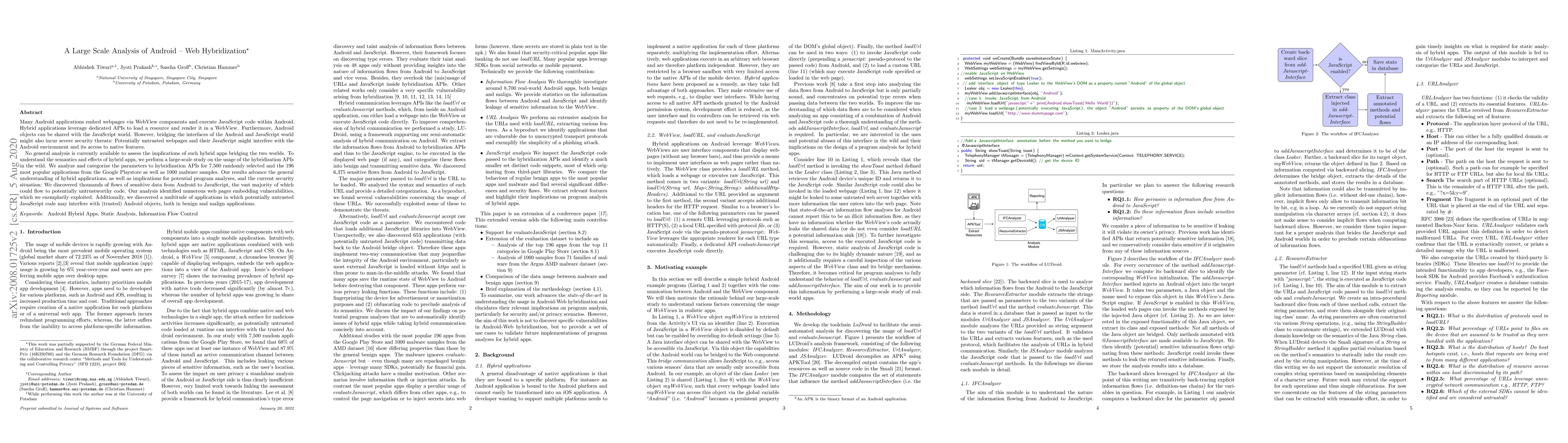 This study analyzes the security implications of Android-web hybrid applications by examining 7,500 random and 196 popular apps, alongside 1,000 malware samples. It reveals thousands of sensitive data flows to potentially untrustworthy JavaScript, highlighting significant security risks and vulnerabilities.