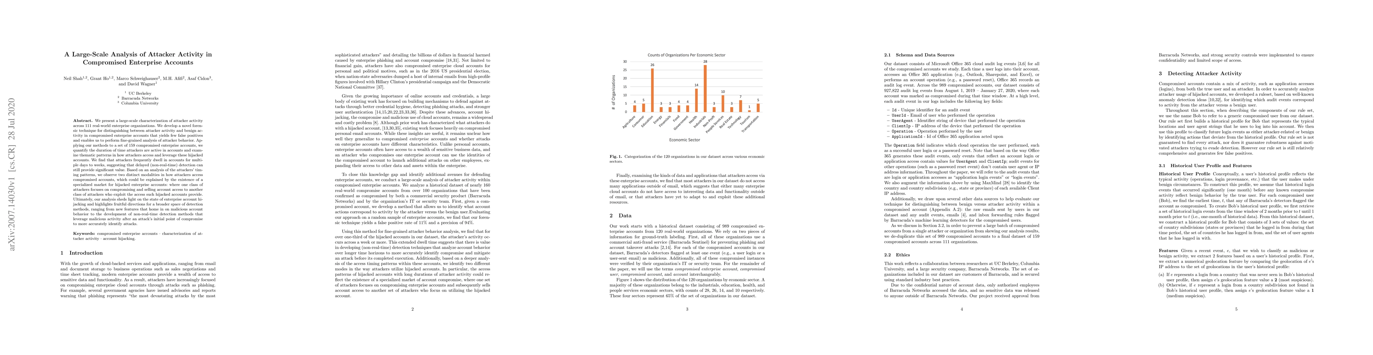 This paper characterizes attacker activity in 159 compromised enterprise accounts using a novel forensic technique, revealing attackers dwell in accounts for multiple days to weeks. The study identifies two distinct attacker modalities, suggesting a market for hijacked accounts, and emphasizes the value of non-real-time detection methods.