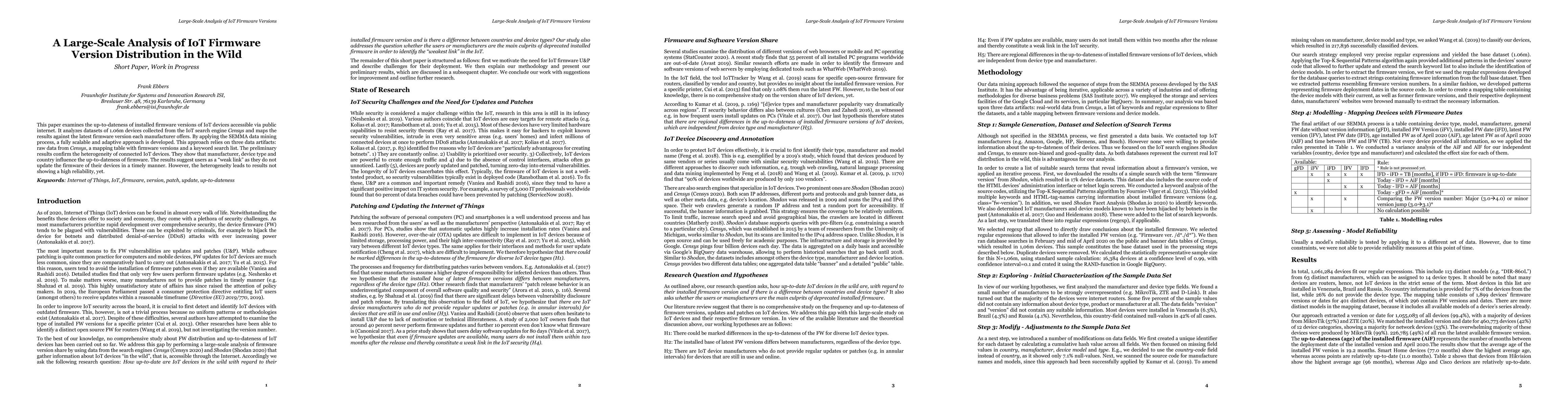 This paper examines the up-to-dateness of installed firmware versions of IoT devices accessible via public internet. It analyzes datasets of 1.06m devices collected from the IoT search engine Censys and maps the results against the latest firmware version each manufacturer offers. By applying the SEMMA data mining process, a fully scalable and adaptive approach is developed. This approach relies on three data artifacts: raw data from Censys, a mapping table with firmware versions and a keyword search list. The preliminary results confirm the heterogeneity of connected IoT devices. They show that manufacturer, device type and country influence the up-to-dateness of firmware. The results suggest users as a "weak link" as they do not update the firmware of their devices in a timely manner. However, the heterogeneity leads to results not showing a high reliability, yet.