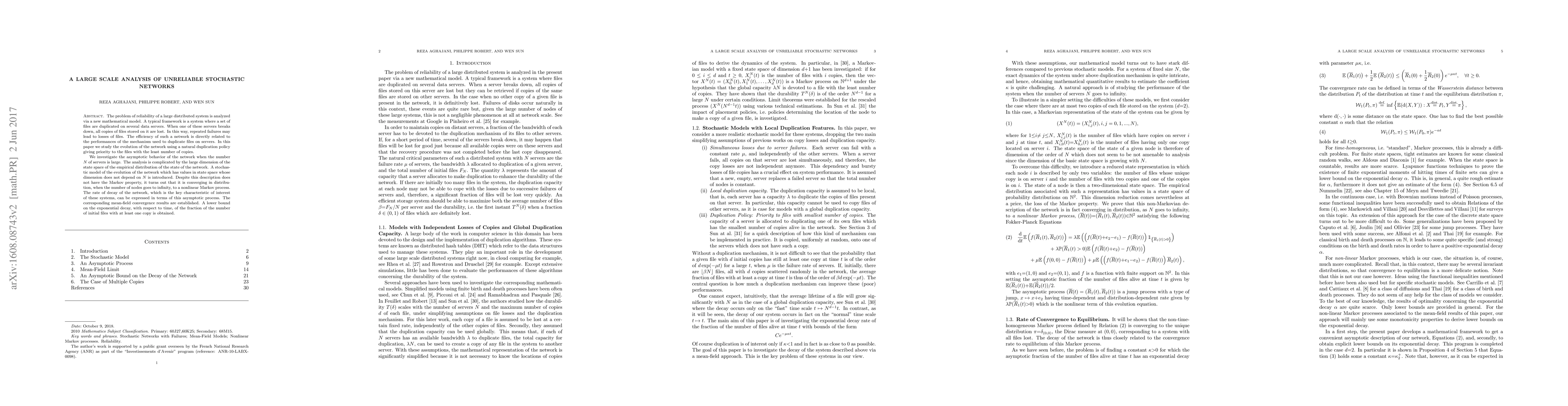 The problem of reliability of a large distributed system is analyzed via a new mathematical model. A typical framework is a system where a set of files are duplicated on several data servers. When one of these servers breaks down, all copies of files stored on it are lost. In this way, repeated failures may lead to losses of files. The efficiency of such a network is directly related to the performances of the mechanism used to duplicate files on servers. In this paper we study the evolution of the network using a natural duplication policy giving priority to the files with the least number of copies. We investigate the asymptotic behavior of the network when the number $N$ of servers is large. The analysis is complicated by the large dimension of the state space of the empirical distribution of the state of the network. A stochastic model of the evolution of the network which has values in state space whose dimension does not depend on $N$ is introduced. Despite this description does not have the Markov property, it turns out that it is converging in distribution, when the number of nodes goes to infinity, to a nonlinear Markov process. The rate of decay of the network, which is the key characteristic of interest of these systems, can be expressed in terms of this asymptotic process. The corresponding mean-field convergence results are established. A lower bound on the exponential decay, with respect to time, of the fraction of the number of initial files with at least one copy is obtained.