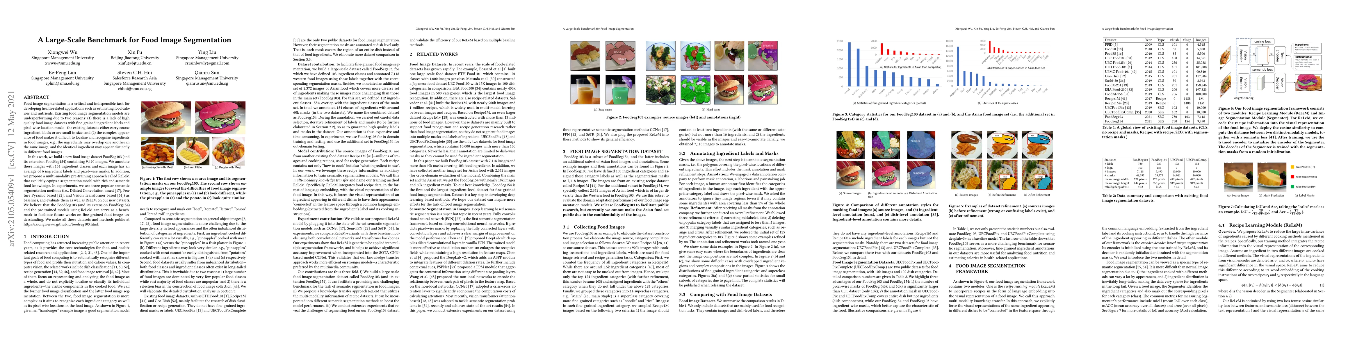 Food image segmentation is a critical and indispensible task for developing health-related applications such as estimating food calories and nutrients. Existing food image segmentation models are underperforming due to two reasons: (1) there is a lack of high quality food image datasets with fine-grained ingredient labels and pixel-wise location masks -- the existing datasets either carry coarse ingredient labels or are small in size; and (2) the complex appearance of food makes it difficult to localize and recognize ingredients in food images, e.g., the ingredients may overlap one another in the same image, and the identical ingredient may appear distinctly in different food images. In this work, we build a new food image dataset FoodSeg103 (and its extension FoodSeg154) containing 9,490 images. We annotate these images with 154 ingredient classes and each image has an average of 6 ingredient labels and pixel-wise masks. In addition, we propose a multi-modality pre-training approach called ReLeM that explicitly equips a segmentation model with rich and semantic food knowledge. In experiments, we use three popular semantic segmentation methods (i.e., Dilated Convolution based, Feature Pyramid based, and Vision Transformer based) as baselines, and evaluate them as well as ReLeM on our new datasets. We believe that the FoodSeg103 (and its extension FoodSeg154) and the pre-trained models using ReLeM can serve as a benchmark to facilitate future works on fine-grained food image understanding. We make all these datasets and methods public at \url{https://xiongweiwu.github.io/foodseg103.html}.