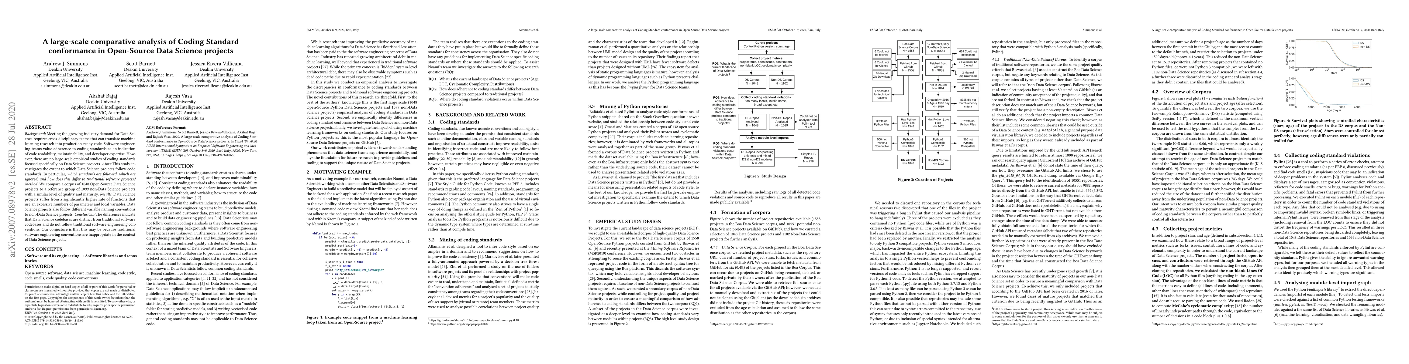 This study compares coding standard adherence in 1048 Open-Source Data Science projects to 1099 non-Data Science projects, finding Data Science projects exhibit higher rates of excessive parameters and local variables, as well as different variable naming conventions, indicating distinct coding practices from traditional software projects.