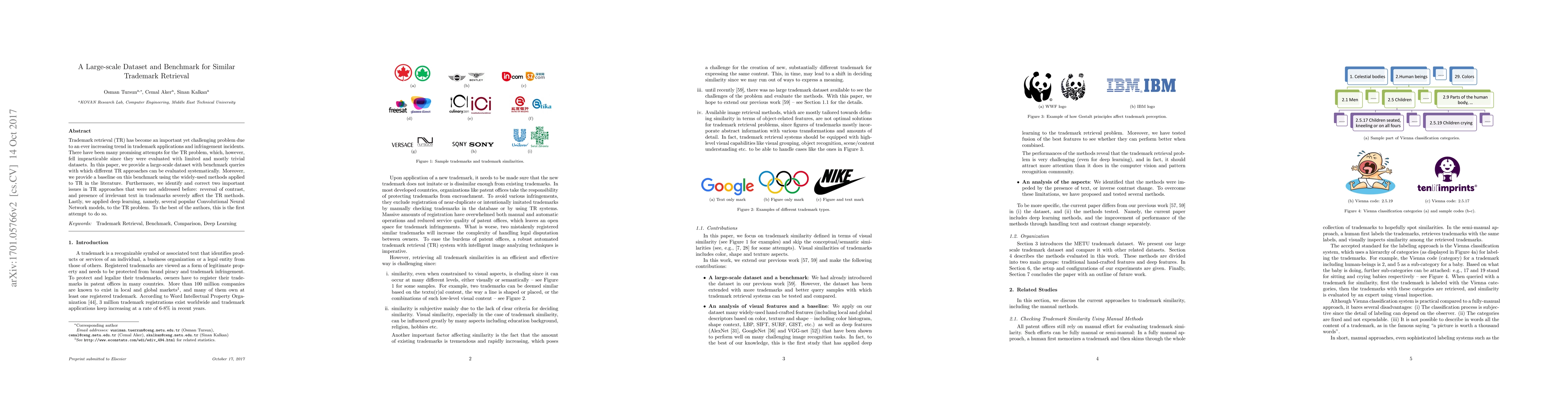 This paper introduces a large-scale dataset for trademark retrieval, identifies issues with existing methods, and applies deep learning to improve performance, providing a benchmark for evaluating similar approaches.