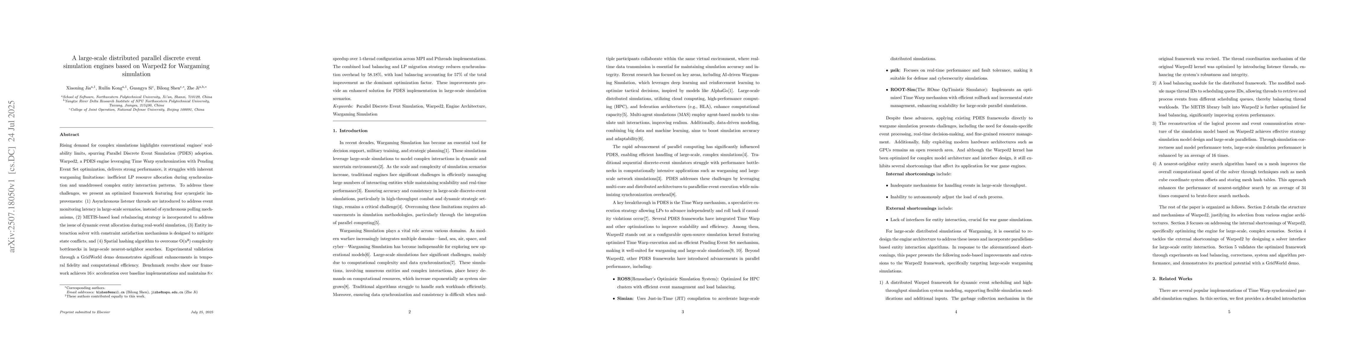 Rising demand for complex simulations highlights conventional engines'scalability limits, spurring Parallel Discrete Event Simulation (PDES) adoption.Warped2, a PDES engine leveraging Time Warp synchronization with Pending Event Set optimization, delivers strong performance, it struggles with inherent wargaming limitations: inefficient LP resource allocation during synchronization and unaddressed complex entity interaction patterns. To address these challenges, we present an optimized framework featuring four synergistic improvements: (1) Asynchronous listener threads are introduced to address event monitoring latency in large-scale scenarios, instead of synchronous polling mechanisms, (2) METIS-based load rebalancing strategy is incorporated to address the issue of dynamic event allocation during real-world simulation, (3) Entity interaction solver with constraint satisfaction mechanisms is designed to mitigate state conflicts, and (4) Spatial hashing algorithm to overcome O(n^2) complexity bottlenecks in large-scale nearest-neighbor searches. Experimental validation through a GridWorld demo demonstrates significant enhancements in temporal fidelity and computational efficiency. Benchmark results show our framework achieves 16x acceleration over baseline implementations and maintains 8x speedup over 1-thread configuration across MPI and Pthreads implementations.The combined load balancing and LP migration strategy reduces synchronization overhead by 58.18%, with load balancing accounting for 57% of the total improvement as the dominant optimization factor. These improvements provide an enhanced solution for PDES implementation in large-scale simulation scenarios.