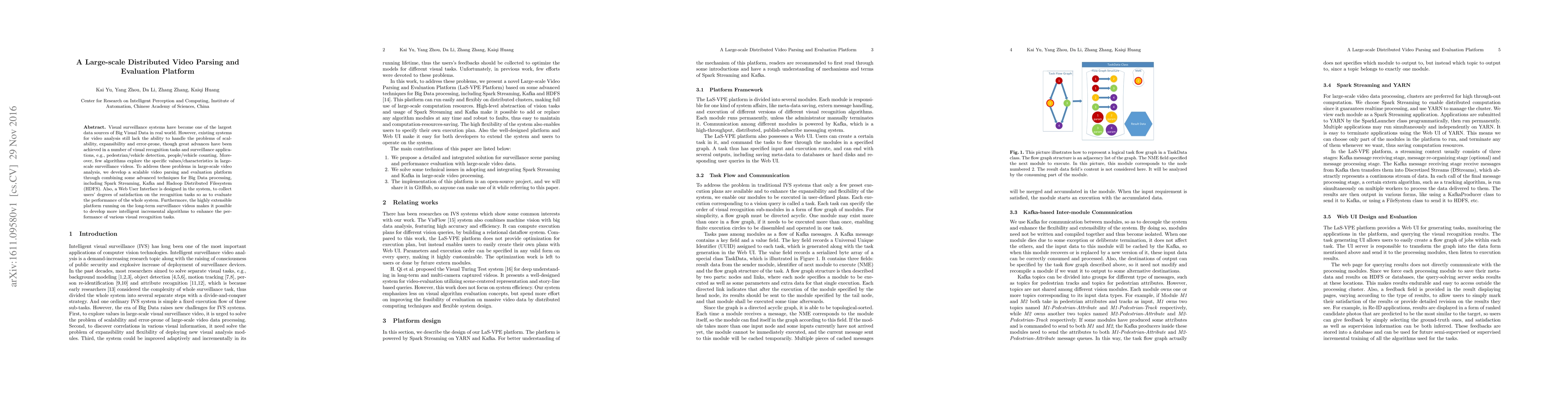 This paper presents a scalable distributed platform for large-scale video parsing and evaluation, leveraging Big Data technologies like Spark Streaming, Kafka, and HDFS. It also includes a web interface for user feedback to assess system performance and facilitate the development of more intelligent algorithms for visual recognition tasks.