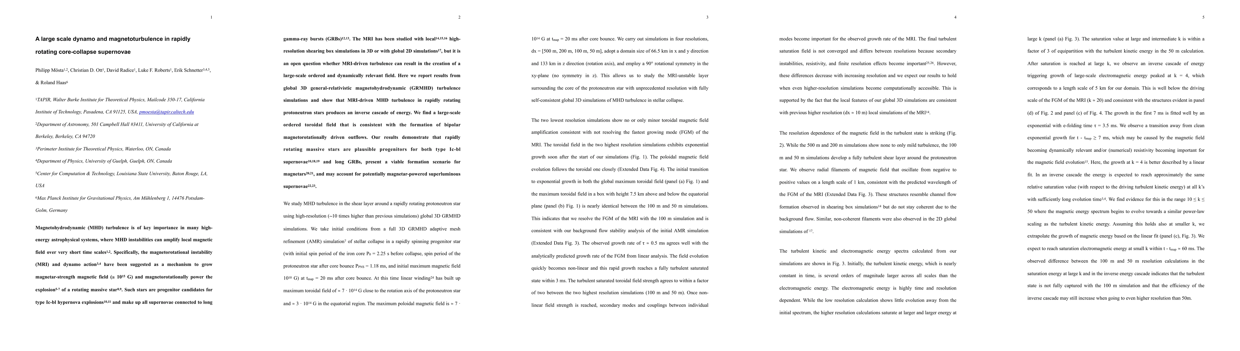 Magnetohydrodynamic (MHD) turbulence is of key importance in many high-energy astrophysical systems, where MHD instabilities can amplify local magnetic field over very short time scales. Specifically, the magnetorotational instability (MRI) and dynamo action have been suggested as a mechanism to grow magnetar-strength magnetic field ($\ge10^{15} G$) and magnetorotationally power the explosion of a rotating massive star. Such stars are progenitor candidates for type Ic-bl hypernova explosions and make up all supernovae connected to long gamma-ray bursts (GRBs). The MRI has been studied with local high-resolution shearing box simulations in 3D or with global 2D simulations, but it is an open question whether MRI-driven turbulence can result in the creation of a large-scale ordered and dynamically relevant field. Here we report results from global 3D general-relativistic magnetohydrodynamic (GRMHD) turbulence simulations and show that MRI-driven MHD turbulence in rapidly rotating protoneutron stars produces an inverse cascade of energy. We find a large-scale ordered toroidal field that is consistent with the formation of bipolar magnetorotationally driven outflows. Our results demonstrate that rapidly rotating massive stars are plausible progenitors for both type Ic-bl supernovae and long GRBs, present a viable formation scenario for magnetars, and may account for potentially magnetar-powered superluminous supernovae.