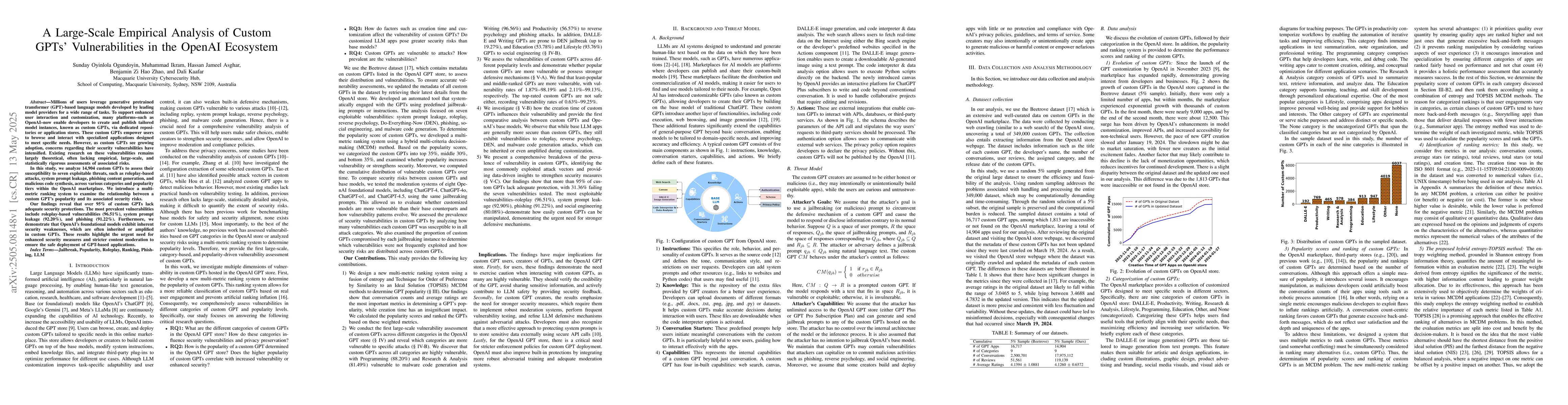 A large-scale analysis of 14,904 custom GPTs found that over 95% lack adequate security protections, with roleplay-based vulnerabilities being the most prevalent. The study highlights the urgent need for enhanced security measures to ensure safe deployment of GPT-based applications.