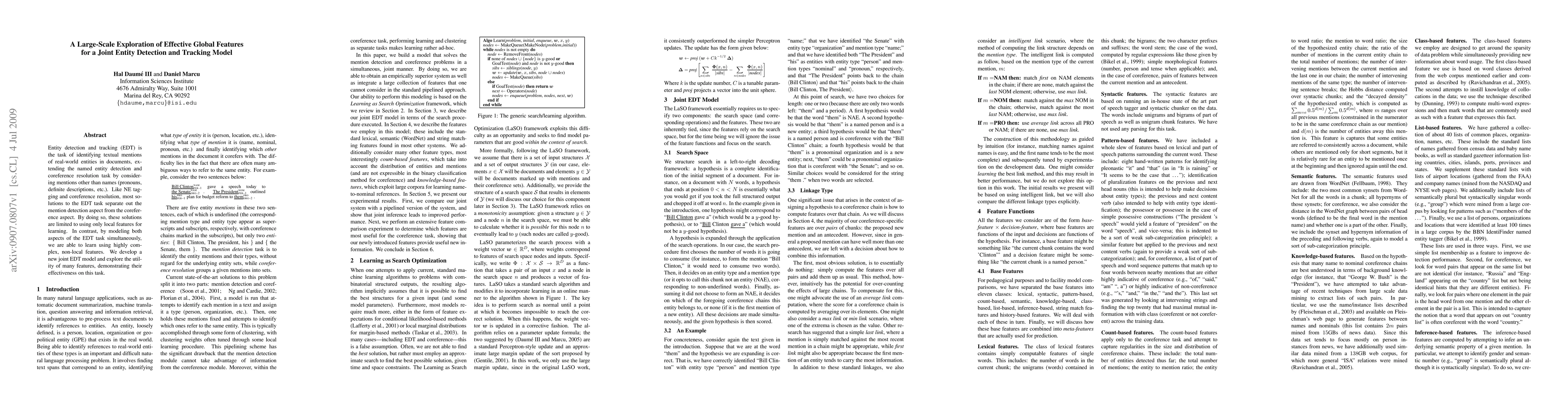 A new joint entity detection and tracking model explores global features for better performance on identifying real-world entities in documents. It finds that non-local features lead to more effective results compared to local ones.