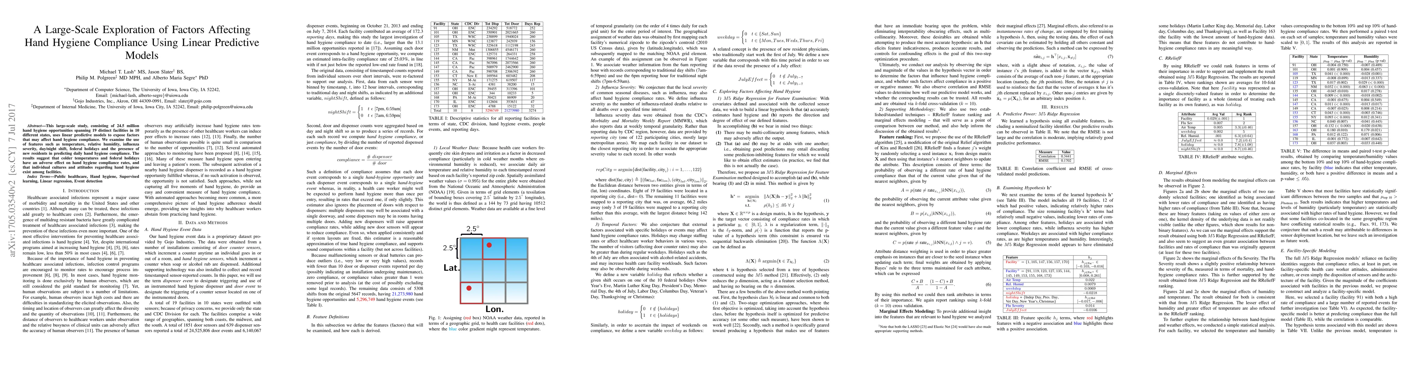 This large-scale study, consisting of 24.5 million hand hygiene opportunities spanning 19 distinct facilities in 10 different states, uses linear predictive models to expose factors that may affect hand hygiene compliance. We examine the use of features such as temperature, relative humidity, influenza severity, day/night shift, federal holidays and the presence of new residents in predicting daily hand hygiene compliance. The results suggest that colder temperatures and federal holidays have an adverse effect on hand hygiene compliance rates, and that individual cultures and attitudes regarding hand hygiene seem to exist among facilities.